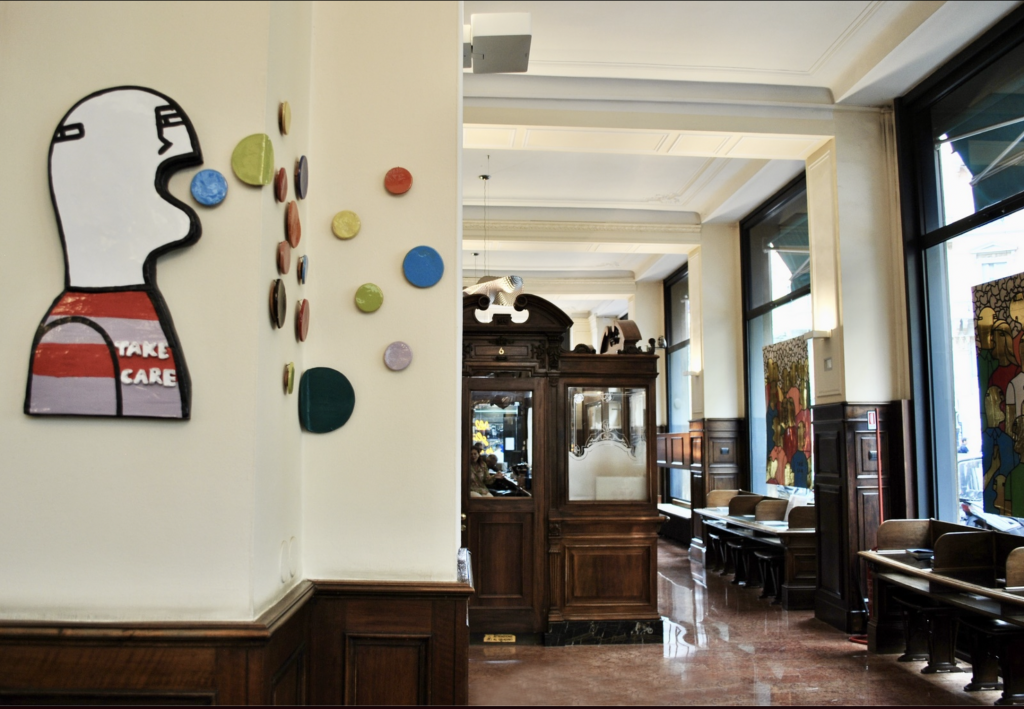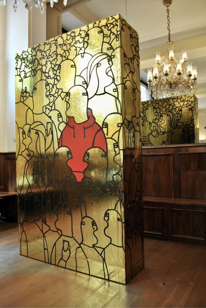 La mostra, che raccoglie una selezione di lavori significativi della produzione di Dusi accanto a installazioni realizzate per l’occasione, verte sul tema dell’isolamento e dell’alienazione all’interno della società di massa. Lo si percepisce già dal primo impatto dai personaggi disegnati sulla coperta termica dall’artista, linee nere che definiscono figurine diventate ormai la sua cifra stilistica. «Io li chiamo “Blablabla”. Sono privi di orecchie poiché incapaci di ascoltare, e se ne stanno in mezzo alla folla con la bocca aperta senza dare valore alle proprie parole. Alcuni di questi, in alcune figurazioni, si distinguono, messaggi si speranza e diversità scritti sulle magliette che indossano». Così lo spazio si ravviva – nel suo rapporto con i visitatori e i dipendenti che quotidianamente attraversano gli spazi, come con i passanti che lo osservano dalla strada – attraverso i teli dorati, nati come gesto di cura (quello di preservare dal freddo) ma che in questo contesto assumono una doppia connotazione. “All that glitters is not gold”, come recita il celebre motto, una citazione colta proveniente dall’opera teatrale “Il Mercante di Venezia” di William Shakespeare. Un legame letterario e storico che gioca con l’identità del luogo espositivo.