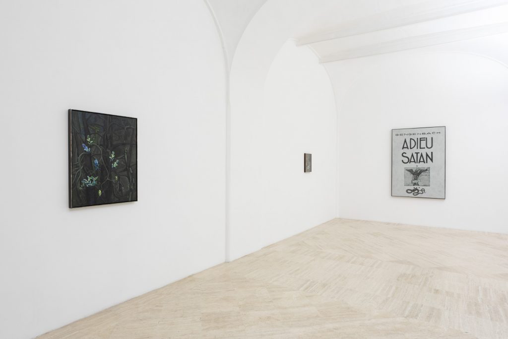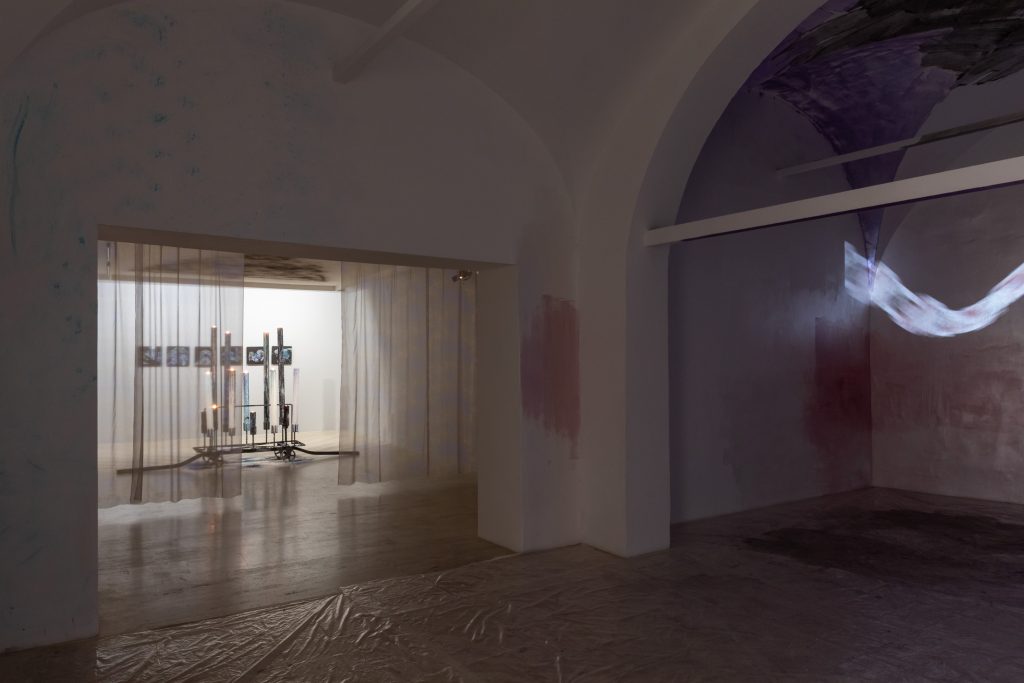 Dai miracoli di Manetas, la mostra prosegue con la condizione femminile su cui Pauline Curnier Jardin (1980) fa cadere il nostro sguardo e la nostra attenzione. L’installazione muove da sei bassorilievi in ceramica smaltata realizzati per il progetto Luna Kino, ispirato al cinema Luna Lichtspiegel, fondato nel 1914 e tenuto aperto durante e subito dopo la Seconda Guerra Mondiale da un gruppo di donne. Dal fondo scuro dei bassorilievi emergono delle figure femminili che sembrano illuminate da una luce selenitica e indossano maschere che ricordano le fasi lunari. Queste figure sono ispirate alle trümmerfrauen, letteralmente ‘donne delle macerie’ che rimuovevano le macerie che invadevano le strade delle città dilaniate dai bombardamenti, diventate icone e strumento per accrescere il senso di appartenenza e la voglia di riscatto del popolo tedesco. Forte è il ricordo di una delle immagini più celebri di queste donne, dinnanzi a un carro, pieno di macerie, sovrastato da una scritta “Che cosa si fa per amore?”. Un carretto è nella stessa stanza, in ferro battuto, la sua base sono due cuori congiunti e le candele di cui è pieno, accese, restituiscono sul soffitto in nero fumo colei che tutto può, per amore: la donna.