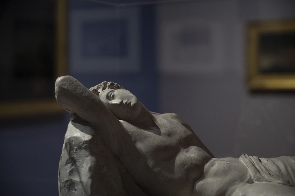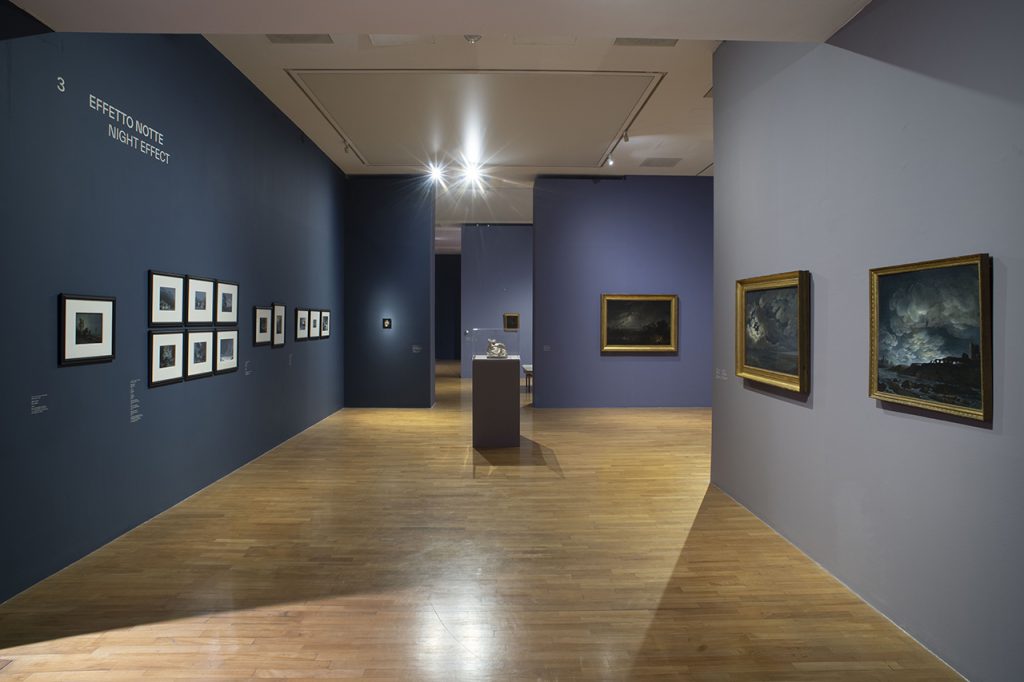 La mostra prosegue con un dialogo tra centinaia di opere, accomunate dalla tecnica del notturno. Tra le sfumature di blu, solcate dai raggi luminosi delle stelle, si è avvolti tra fascino ed enigma. Ognuno degli artisti ne racconta un frammento, una visione diversa. Joseph Wright of Derby cattura la forza del Vesuvio al chiaro di luna, mentre Giovanni Battista De Gubernatis coglie la delicatezza delle fronde riflesse sull’acqua. Arturo Martini scolpisce sognatori con la testa all’insù e Felice Casorati riempie i fondi delle sue tele di stelle. Franz von Stuck celebra i danzatori spensierati della notte, Victor Hugo avvolge castelli misteriosi nella nebbia e Odilon Redon sceglie la notte come luogo dell’inconscio.