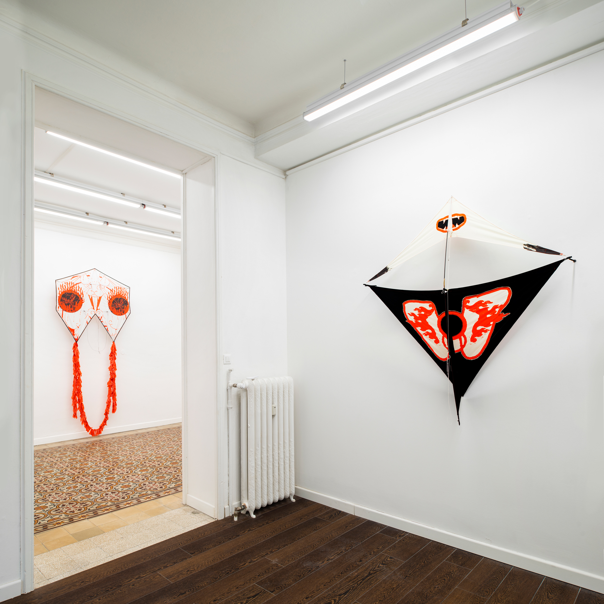 The Address Gallery presenta nelle sue sale i recenti lavori di Oliviero Fiorenzi: sono grandi aquiloni dipinti, bloccati per un istante sulle pareti delle sale. Nel forte impatto scenico dell’imposta fissità, la prima percezione è di “cogliere l’attimo” – in bilico tra vita e stasi quasi da teca entomologica – e invita a pensare al senso del divenire evocato dal giocattolo-aquilone, ma anche all’evoluzione del lavoro dell’artista. Le opere – come nota Piergiorgio Caserini nella presentazione – alterano lo spazio, dalla superficie di appensione alla sala tutta, rimandando alla scaturigine del lavoro di Fiorenzi: graffiti che modificavano i contorni del contesto urbano.