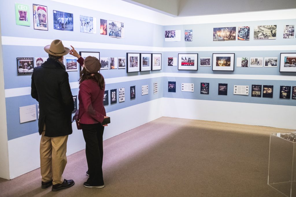 Mediations (1978-1982), che dà il titolo alla mostra, è anche la quarta sala del percorso – è stato anche il titolo di una mostra a Newcastle nel 1982 – e racconta di una comunità diversa dalle ragazze, una comunità in cui Meiselas si è ritrovata, quella nicaraguese. È il 1981 quando Meiselas pubblica nel libro Nicaragua le sue foto della rivoluzione, che ha scelto tra il giugno del 1978 e il luglio del 1979 con un attento processo di selezione che però non è andato di pari passo con l’uso, delle stesse, da parte dei mass media: come le immagini vengono utilizzate in contesti diversi? In questa stanza le fotografie sono suddivise su tre piani: al centro Meiselas ha disposto le immagini della prima edizione del libro – a volte interrotte da immagini incorniciate che sono state esposte in un contesto artistico e sono entrate a far parte di collezioni pubbliche e private – in basso ci sono le immagini che sono state considerate per la pubblicazione e poi scartate, accompagnate anche da alcune note che testimoniano le scelte fatte, e in alto invece ci sono i ritagli di riviste internazionali, che rivelano un contrasto tra la narrativa di Meiselas e quella dei media, che spesso preferiscono immagini d’azione piuttosto che di momenti quotidiani.