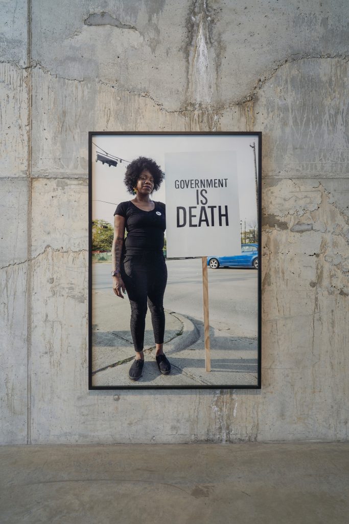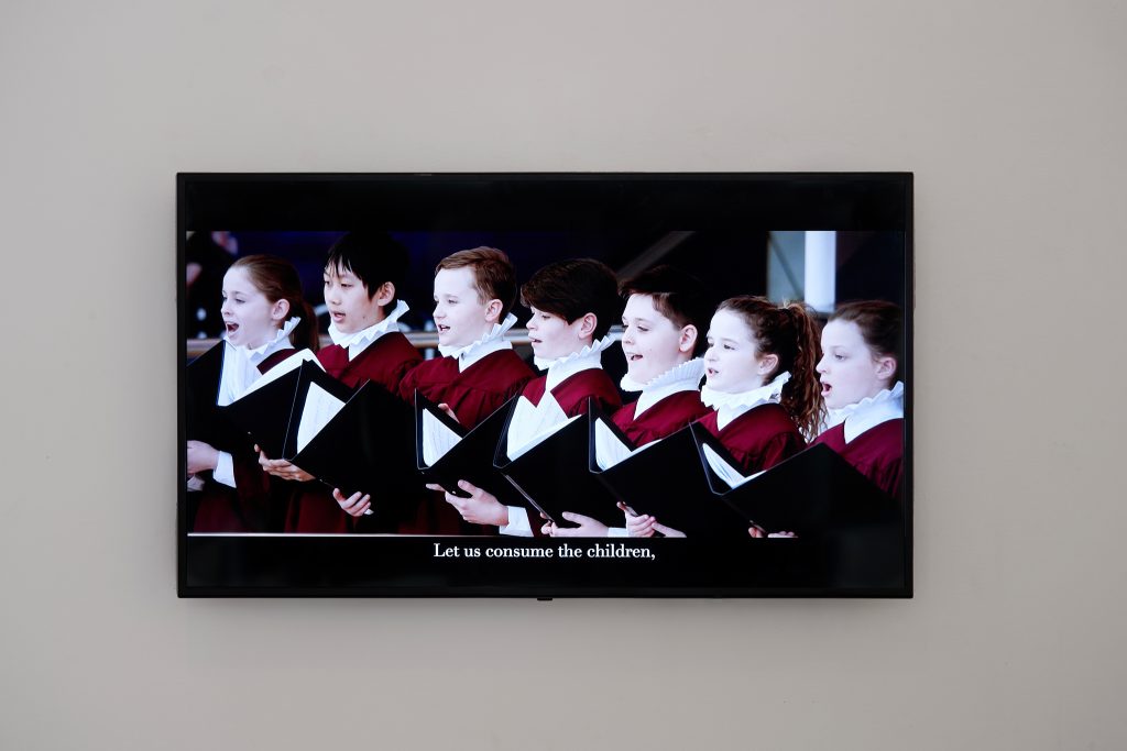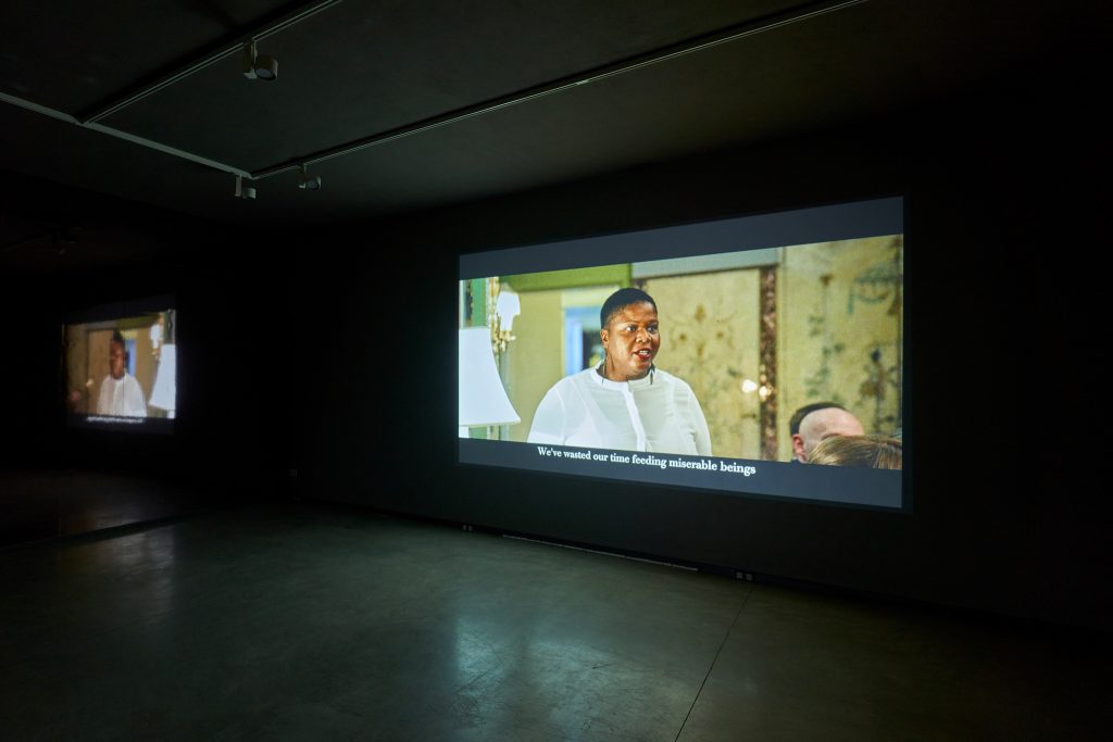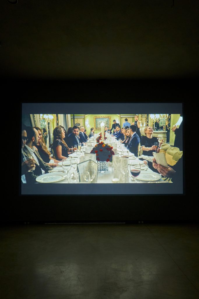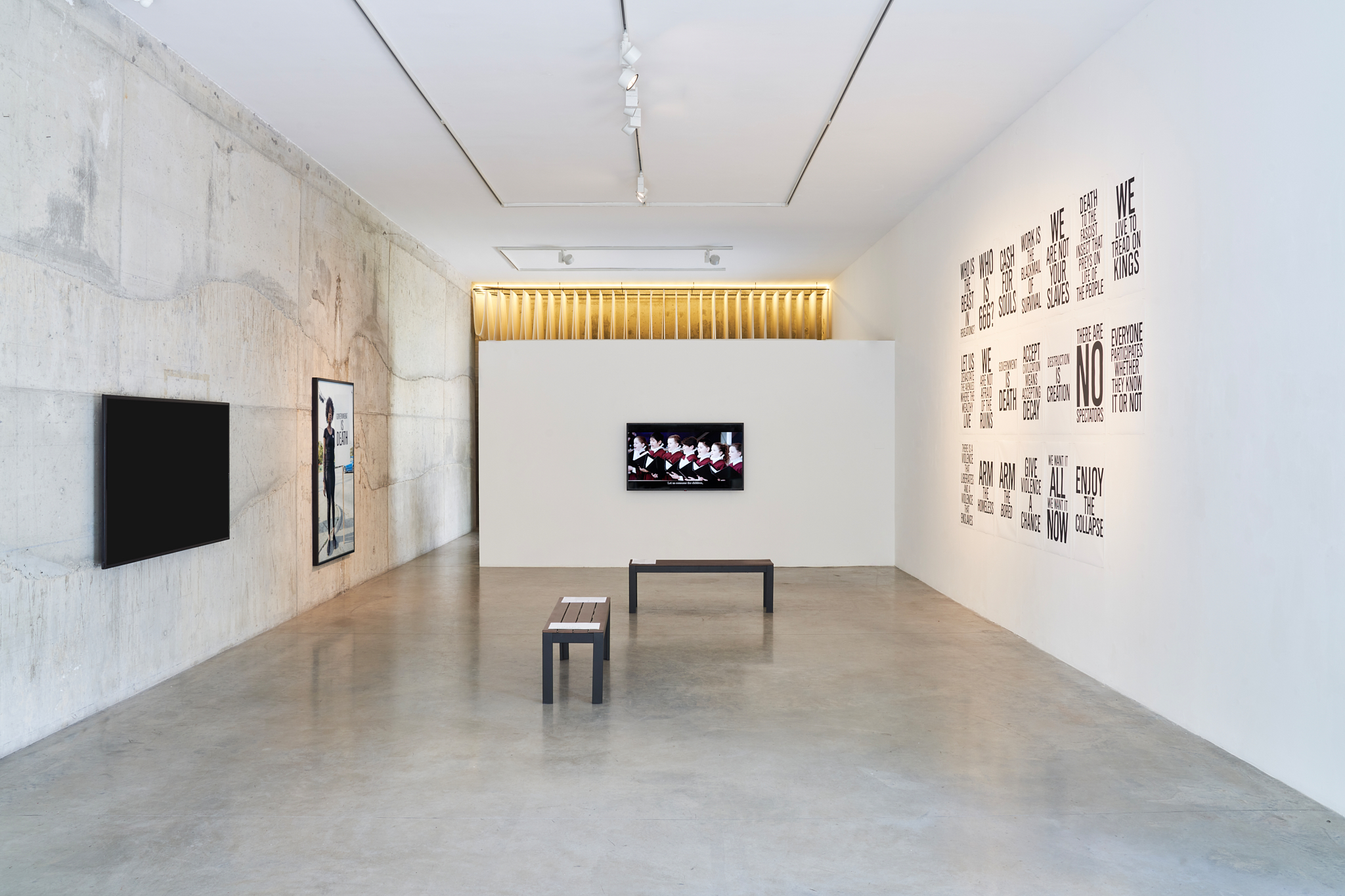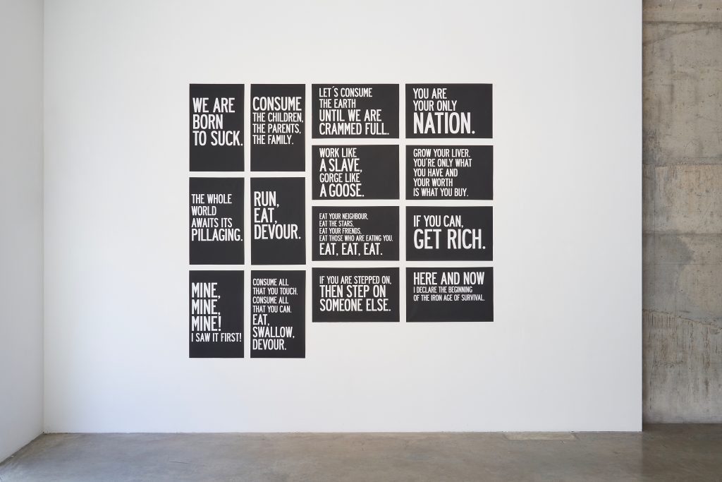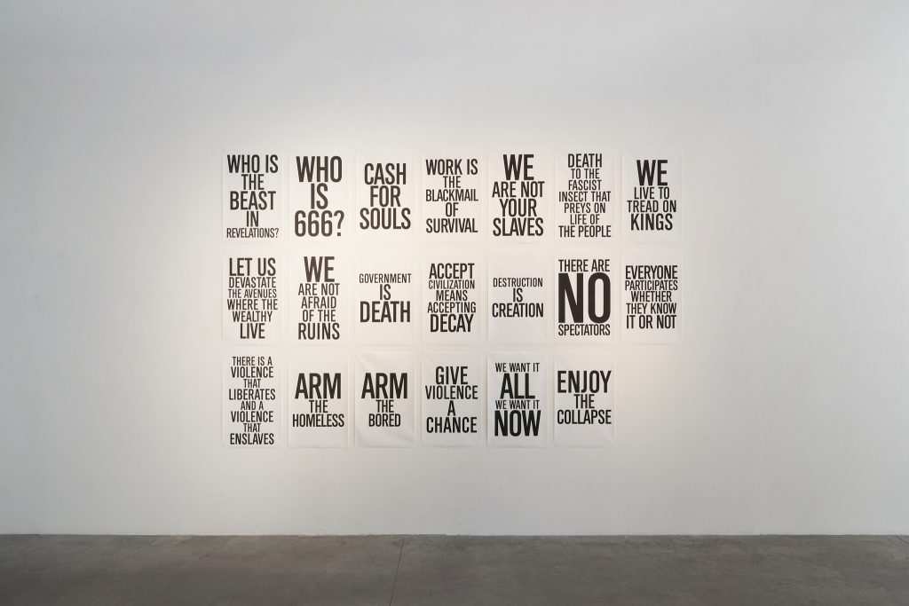 Non possiamo prescindere concettualmente e nemmeno visivamente: l’allestimento della mostra in Prometeogallery Ida Pisani, pensato su entrambi i piani, accompagna alla visione dei tre video – uno per atto – l’esposizione cartellonistica, propria dell’estetica della protesta, di alcuni intercalari linguistici che regolano l’andamento del mondo, sempre più corrotto dalle dissimmetrie del capitalismo contemporaneo.