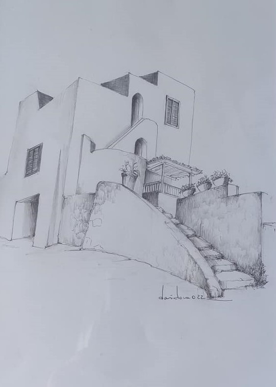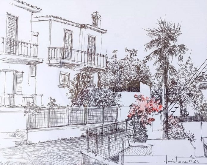 Vi sono disegni delle case nella tradizione architettonica procidana. Non sono freddi prospetti, c’è qualcosa di diverso: le case, quasi sempre, non sono rappresentate soltanto da un punto di vista frontale ma anche da uno laterale. Cosicché sembrano flettersi, come per una carezza, sotto lo sguardo, da sinistra a destra, dell’autrice e quindi dei visitatori, che non si accorgono di questo cambiamento ma avvertono una sorta di inspiegabile stranezza, come un tocco di magia. Queste costruzioni procidane sono molto familiari a Mariapia – che ci mostra anche il disegno di quella dove d’estate va ad abitare – e, se è vero che le ritrae “in presenza”, è anche vero che, nelle loro immagini, c’è una rielaborazione quasi inconscia dell’affettuosa memoria del luogo. Il disegno è realizzato con una semplice penna biro che rende, con la diversa pressione della mano sul foglio, la diversità dei materiali rappresentati: la pietra del muro o il legno delle imposte. E con la biro Maria Pia riesce anche a rendere la luce del momento. «Devo fare in fretta – ci dice – la luce cambia e non posso sbagliare, perché non ho modo di cancellare. Disegnando, il movimento della mano si accorda con la mente, e devo essere molto concentrata». Per lei il disegno è la base di ogni realizzazione artistica. «Il disegno è la base di tutto».