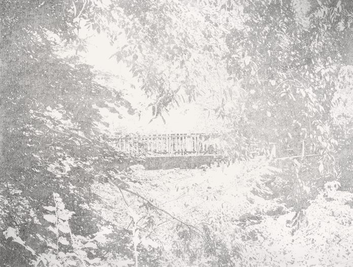 Anno focale del suo percorso artistico il 2012 quando l’artista “incontra” una piccola incisione di Barthelémy Menn (1815-1893), artista ginevrino di grande importanza per la pittura svizzera di paesaggio del secondo Ottocento e per Gabutti stesso perché inizia a trasporre tale opera dai suoi 180×115 mm ai 2200×1500 mm di fogli grandi con un forte salto di scala. In tale modo Gabutti crea disegni monumentali a inchiostro con notevole impiego di tempo e con risultati eccellenti anche di chiaroscuro, rendendo contemporaneo il paesaggio. Un incanto fatto di boschi, intrichi di rami, cascate, giardini e sentieri (interpretato spesso come sentiero che conduce verso l’ignoto, tema simbolista) senza dimenticare il paesaggio alpino irrinunciabile per chi vive in Svizzera. Le rovine dei romantici diventano per lui un ponte di ferro e un contorto gazebo le cui forme si integrano con quelle fluide create dalla natura, il tutto realizzato con inchiostro o grafite e recentemente anche con matite colorate.