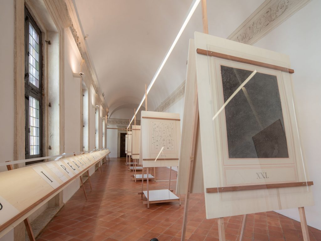 Questo il senso del profondo studio realizzato sui particolari del Palazzo che ci accompagna nel guardare con occhi diversi i rapporti architettonici di un modello del Quattrocento che torna ad essere luogo di incontro anche delle nuove generazioni, frutto di un lungo lavoro portato avanti in collaborazione con istituti di alta formazione quali l’Isia di Urbino e la Scuola di dottorato in Scienze dell’Architettura di Sapienza, Università di Roma. Molinari ci parla di <<macchina viva che si rigenera>>, introducendo la mostra che si inserisce perfettamente lungo il perimetro delle Sopralogge, affacciate sul cortile d’onore al primo piano, spazio emblematico che può essere percorso, con i suoi quattro lati che ospitano quattro letture diverse, in maniera ininterrotta. Il dialogo con il passato si instaura fuori dagli allestimenti delle sale principali per non intralciare il percorso museale e farci entrare all’interno di una nuova fucina che mostra tutta la sua innovazione, attraverso dispositivi visivi nuovi che trasportano dentro la preziosità dei particolari, li analizzano e li innalzano per trasformarli con il dovuto rispetto, stimolando il visitatore a guardare con maggiore attenzione.