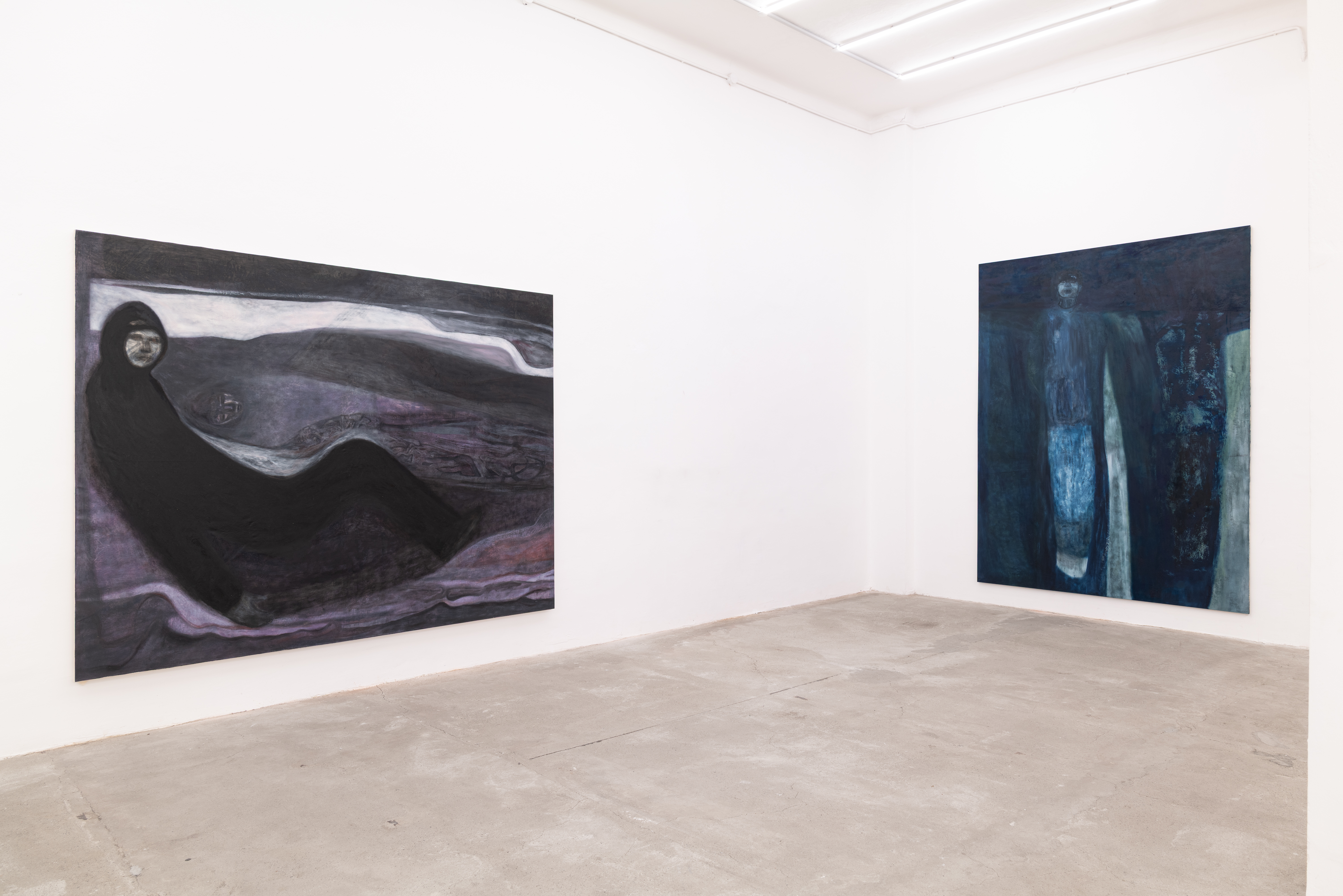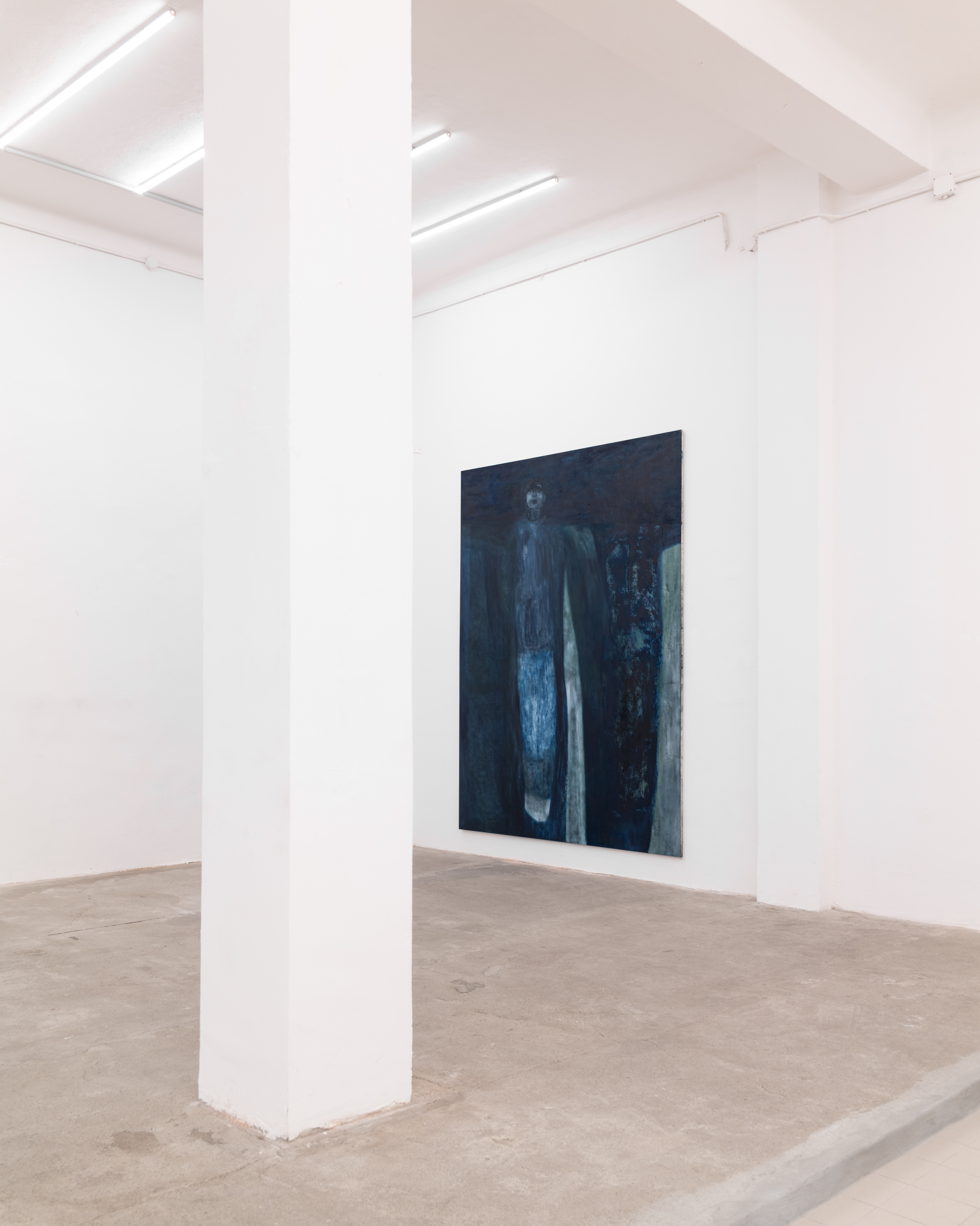 Nell’opera Blu, quasi solitario (2025), ad esempio, questa resa materica viene declinata in modo differenziato per ciascuna delle due presenze che abitano la tela, attribuendo loro un peso specifico e un valore distinti. La figura a destra appare dotata di una maggiore concretezza pittorica rispetto a quella di sinistra, nonostante presenti sembianze del tutto indefinite, quasi irreali. Quest’ultima, al contrario, pur mantenendo una propria integrità visiva, sembra svanire in una dimensione attenuata. Tale contrapposizione accentua il senso di isolamento e la distanza psicologica tra le presenze, nonostante la loro vicinanza fisica sulla tela.