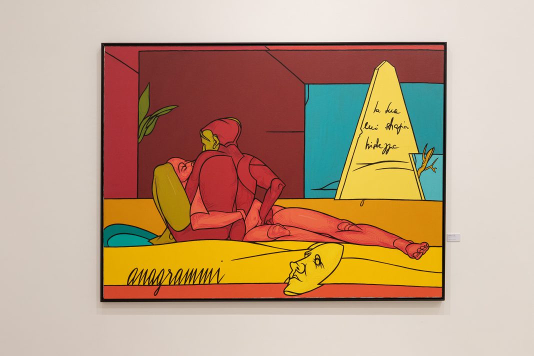 Stessa sorte nel dipinto Penthesilea che mostra il salvataggio di una fanciulla-statua da parte di soldati con elmo che cercano di aiutare la ragazza avvalendosi però di un mezzo di soccorso attuale cioè l’ambulanza. La divergenza concettuale e simbolica si allinea con i forti contrasti cromatici all’interno di ogni tela. Nel dipinto Anagrammi vengono rappresentate due figure in una scena erotica, le cui sinuosità richiamano le rotondità della Venere di Urbino di Tiziano o della Grande Odalisca di Ingres, il tutto offuscato da un velo di mistero generato dalla frase enigmatica presente sulla piramide gialla che svetta dietro i due amanti.