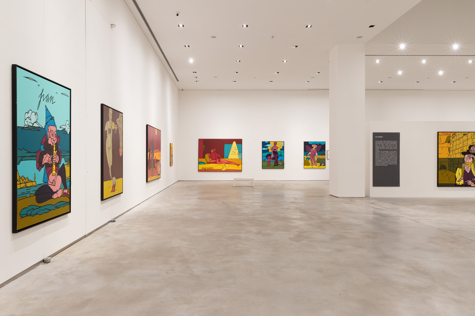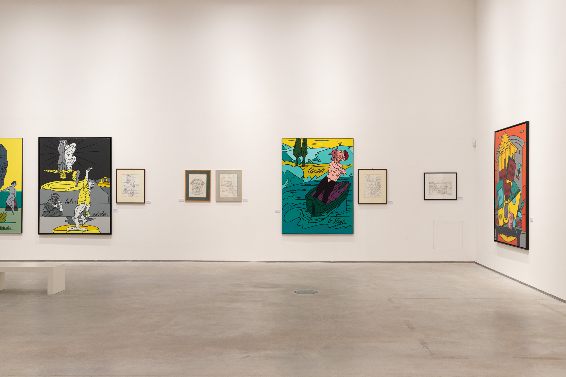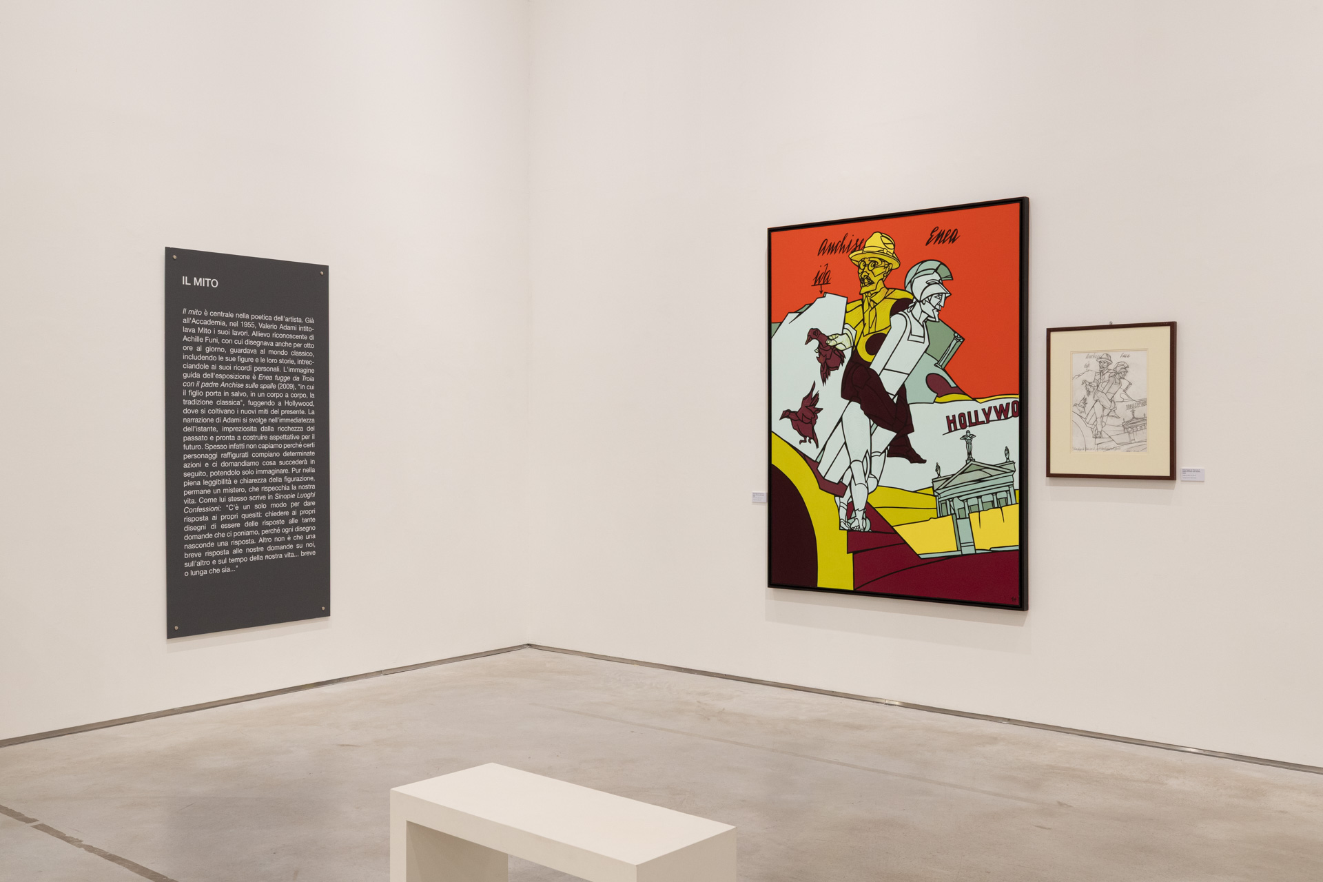 I grandi formati delle tele, che si staccano dalle pareti bianche, consentono di immergersi totalmente nella visione mitologico-pop di Adami mentre i disegni a matita mostrano lo studio sulla genesi del dipinto finale.