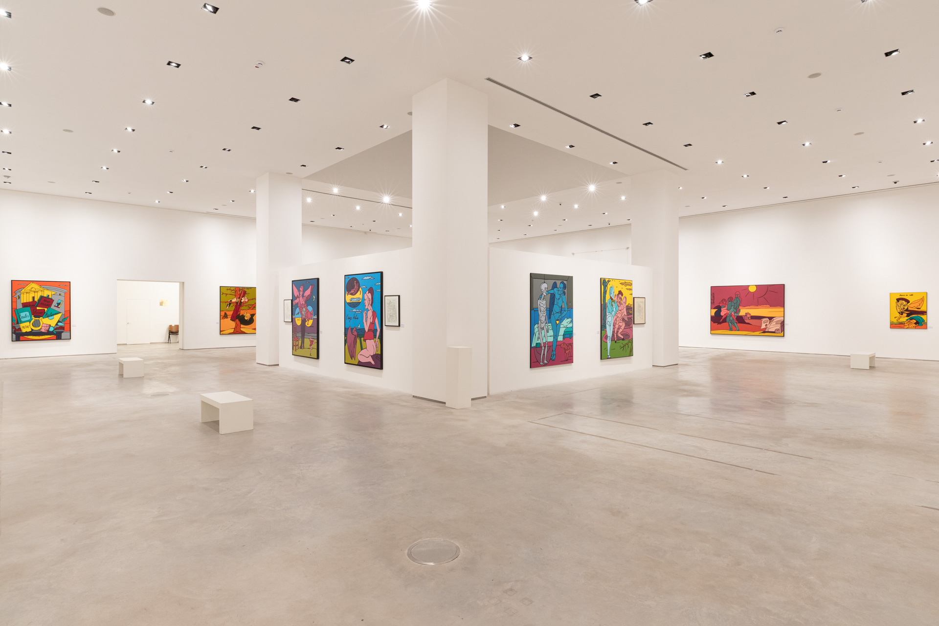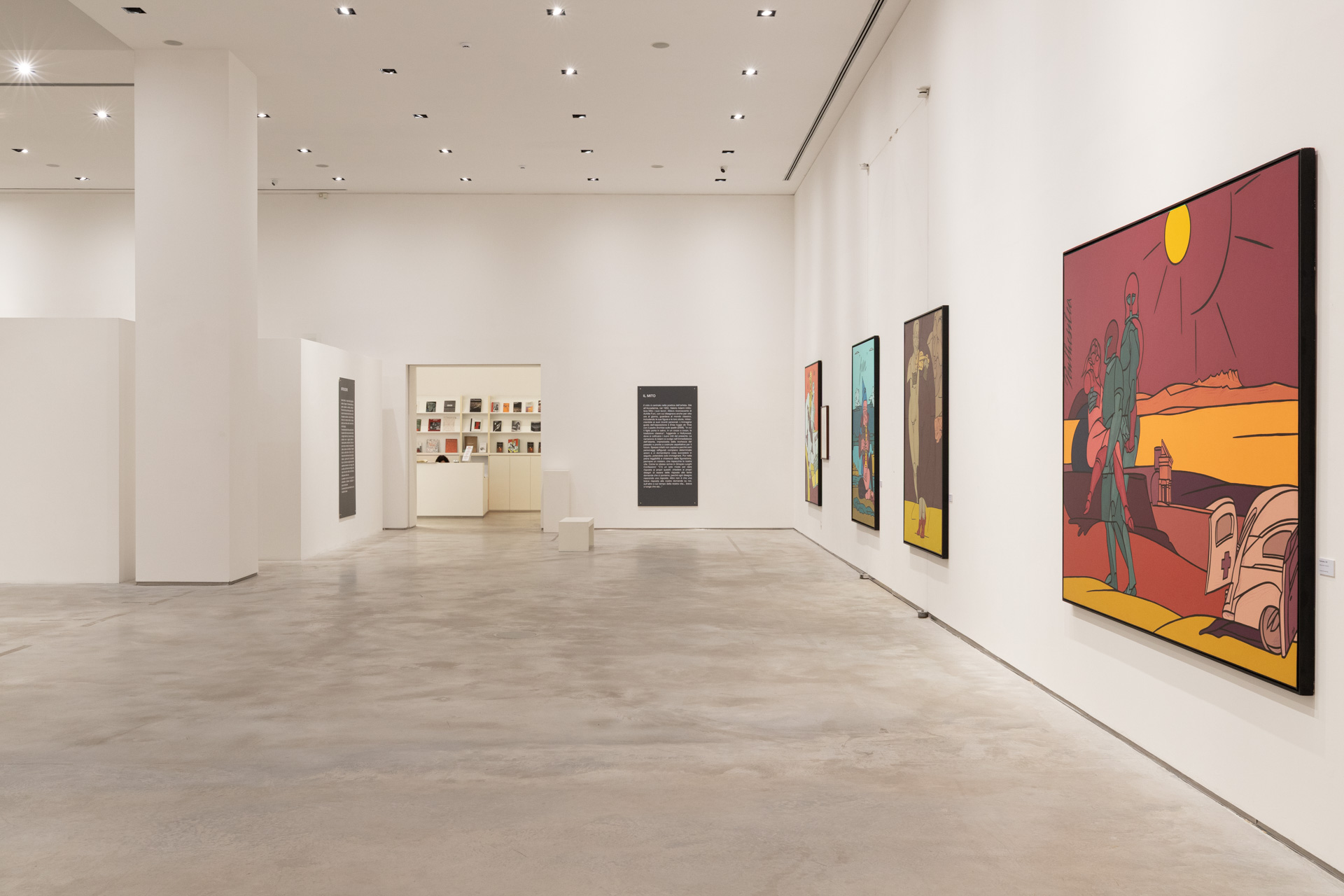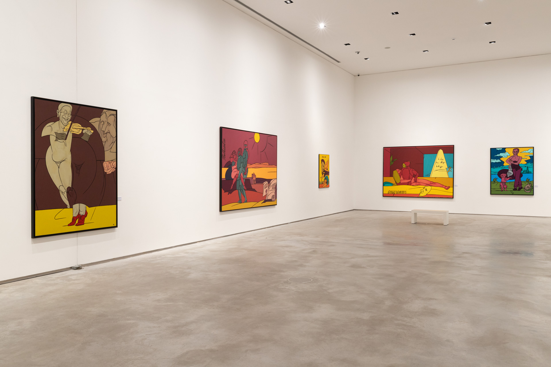 I grandi formati delle tele, che si staccano dalle pareti bianche, consentono di immergersi totalmente nella visione mitologico-pop di Adami mentre i disegni a matita mostrano lo studio sulla genesi del dipinto finale.