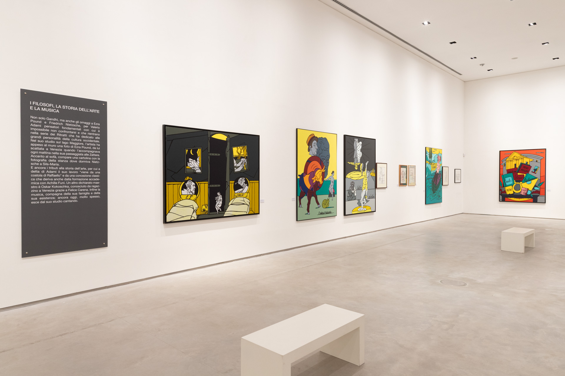 Questi viaggi e incontri, che farà con la moglie Camilla, segneranno profondamente la cultura e la visione artistica di Valerio Adami, che spesso affronterà nelle sue opere tematiche tipiche di culture differenti. L’esposizione infatti presenta 50 opere accuratamente selezionate che risentono dell’influsso di varie culture e studi. La personale si apre con le due grandi ed emblematiche Crocifissioni, attualizzate in chiave contemporanea. Si procede quindi per aree tematiche: gli angeli, l’India, il mito, i filosofi, la storia dell’arte e la musica.