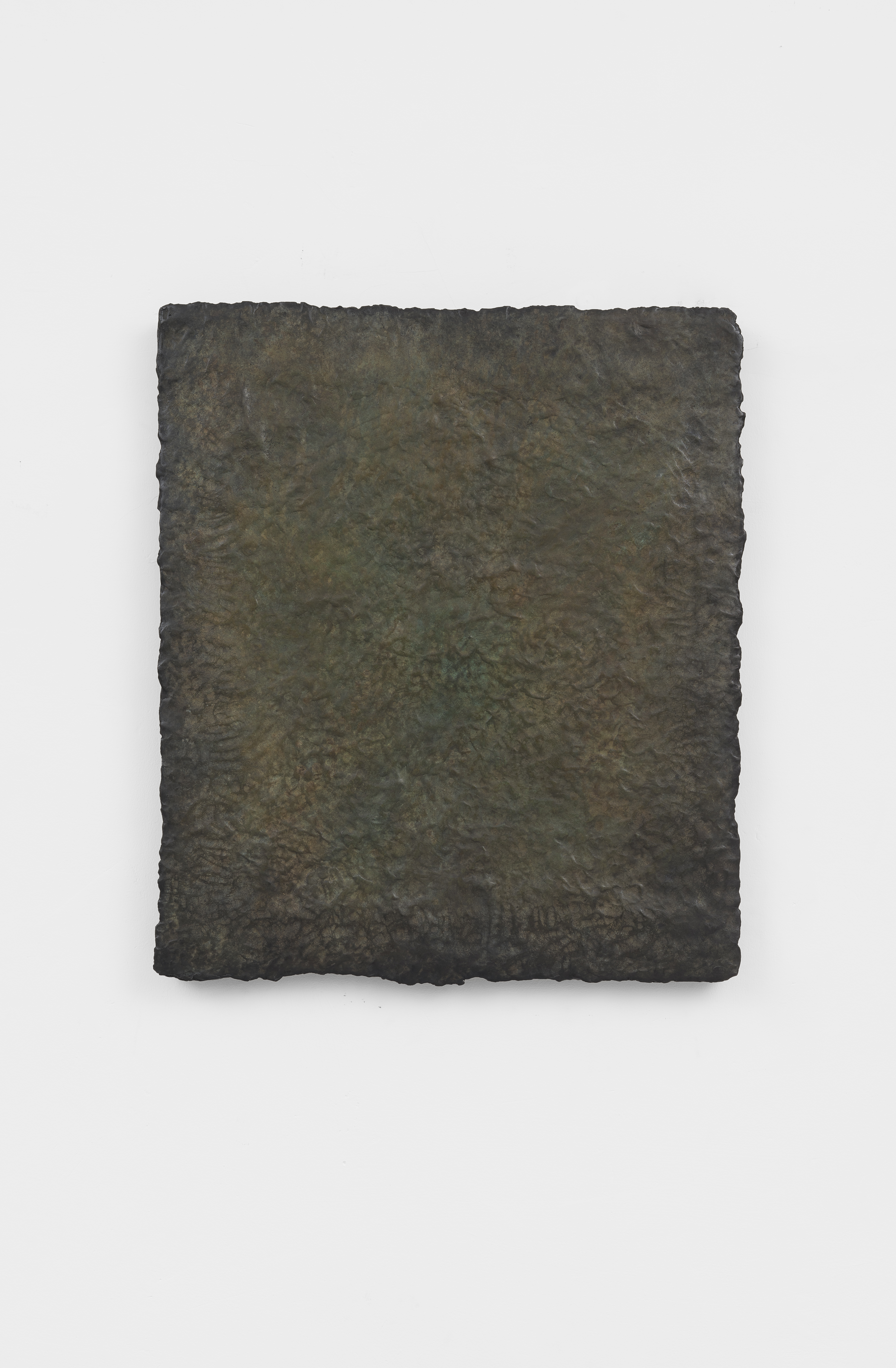 L’andamento omogeneo del quadro è spesso interrotto da un inserto centrale di forma quadrata. Un ombelico generatore, simbolo propulsore e iniziatore del tutto. Questo nucleo centrale è in bronzo, ricavato da un calco di altri quadri poi distrutti. La matrice originale svanisce e ne resta un ordine nuovo che imprime contorni e stimoli alla tela.