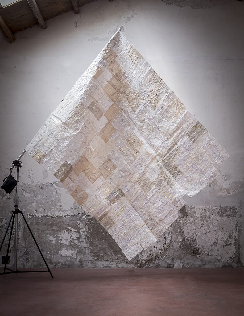 Il vettore, come l’artista lo intende, è l’intenzione che muove, la direzione intrinseca alle cose. Le sue installazioni non sono oggetti immobili, ma appunti intuitivi che si espandono nel tempo. Ogni gesto lascia un residuo, ogni residuo è una possibilità. Dalla bandiera di carta che accoglie e saluta i visitatori — realizzata con i fogli della contabilità personale dell’artista, un archivio della sua vita quotidiana assemblato come un diario inconsapevole — si coglie la fragile forza del gesto che accetta di perdersi per ricominciare. È una resa, sì, ma non tragica; è l’accettazione del flusso delle cose, del loro moto imprevedibile.