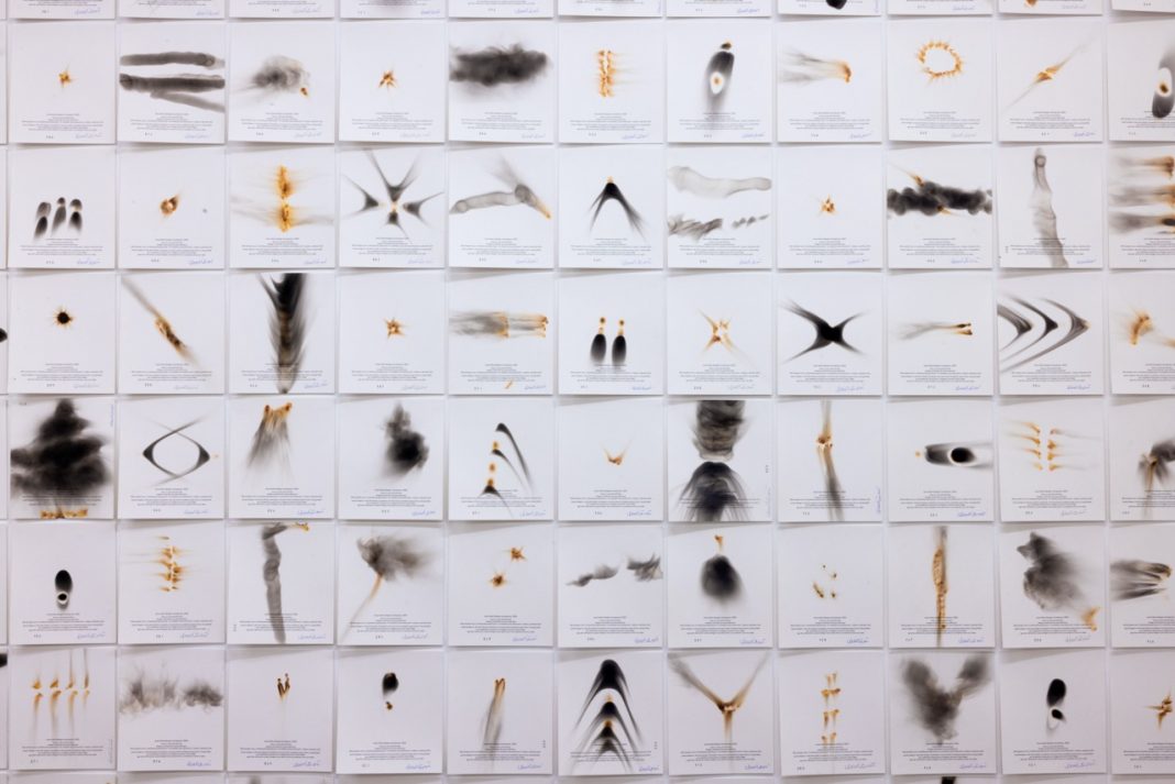 Il percorso di visita diventa così narrazione di un viaggio che prende avvio da Disegno Incompiuto, opera inedita di Cesare Pietroiusti. L’installazione si compone di 400 fogli disposti a coprire un’intera parete, sui quali sono state impresse forme dai toni caldi e bruciati tramite la tecnica del “fuoco su carta”. La scelta di usare fogli Old Mill, resistenti al fuoco, rivela la volontà di testare i limiti di un materiale solitamente percepito come delicato e infiammabile, tracciando sulla superficie nubi e scintille con l’uso di fiammiferi e candele.