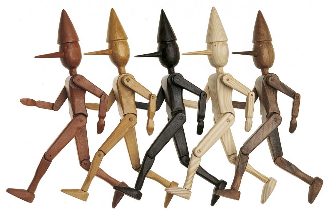 Sette le sezioni della mostra di Pinocchio a Firenze, curata da Lucia Fiaschi innamorata del suo tronco d’albero che prova solletico mentre Geppetto lo lavora. Il pezzo di legno degli statunitensi Tim Rollins & K.O.S. ha gli occhi, i Pinocchi di Oliviero Toscani marciano allegramente, il mobile di Alexander Calder riceve vita da un soffio d’aria, Gionata Francesconi prende per il naso Pinocchio in Ostinazione, Alberto Giacometti fa risiedere il segreto della sua vita nel naso che cresce, Jim Dine gli fa indossare ricchi abiti alla Disney mentre Sam Havadtoy ne fa un bimbo e per Riccardo Dalisi è una virgola di buonumore.