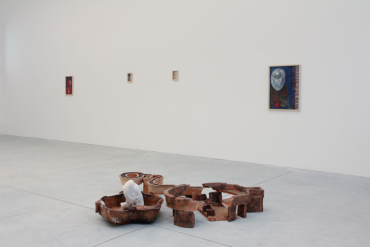 Il dialogo tra Marcello Tedesco e Cesare Zavattini era iniziato un anno fa negli spazi di MTN – Museo Temporaneo Navile, per la mostra “Aspettando Za”. L’esposizione, programmata per novembre-dicembre 2020, a causa del lockdown è stata aperta al pubblico solo a febbraio 2021. Marcello Tedesco, però, è riuscito a sfruttare quei mesi di chiusura per approfondire il suo legame con Cesare Zavattini. La project room del museo, infatti, si trasforma nello studio dell’artista che produce, circondato dai lavori del maestro, il gruppo scultoreo presentato appunto nella mostra “A vrès”, circondato, anche questa volta, e, quasi protetto, dai dipinti di Zavattini. Questi ultimi sono stati volutamente disposti a un’altezza ravvicinata al pavimento e sembrano non solo volersi unire al gruppo scultoreo ma anche suggerire uno sguardo verso il basso.