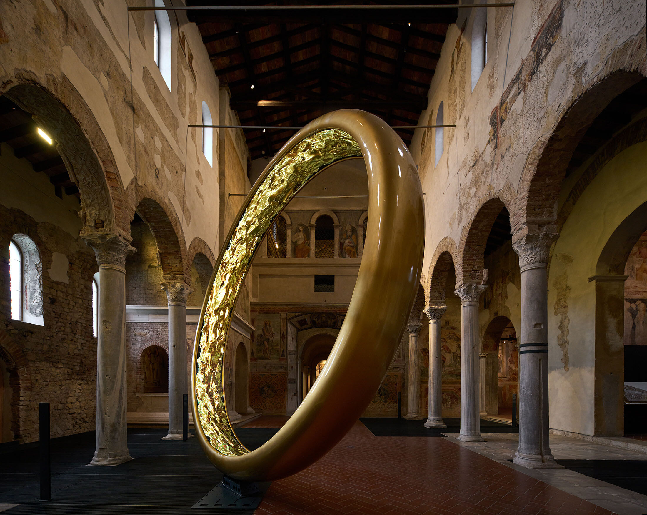 Nella Basilica di San Salvatore una fede nuziale si incastona e sposa i beni e i valori storico-artistici dell’architettura longobarda. Plessi sposa Brixia, opera che dà il titolo anche alla mostra, è portatrice di valori profondi come la fede, il rispetto e l’amore per il passato, sorgente di virtù a cui ispirarsi e da cui muoversi, sempre, nel viaggio verso il futuro.