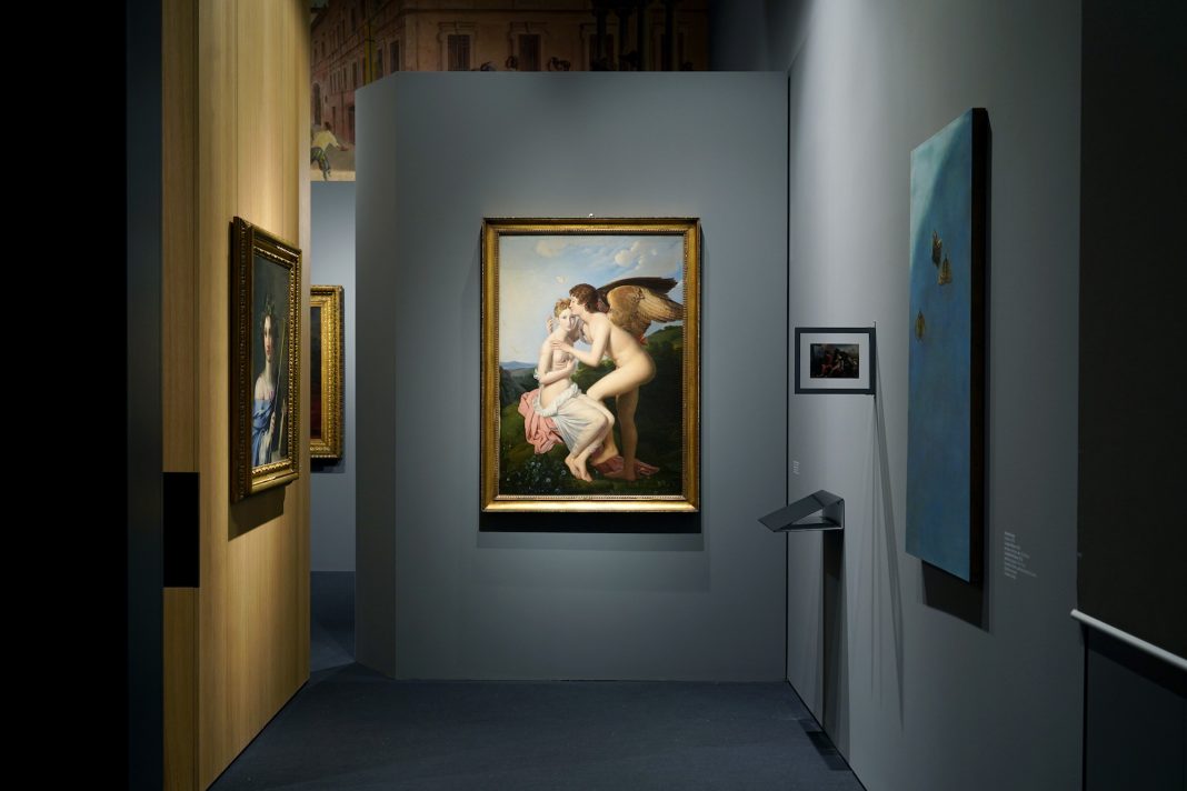 La mostra non dimentica l’arte contemporanea con tre dipinti eseguiti da Andrea Facco, Omar Galliani e Andrea Mastrovito. In particolar modo, Le farfalle di Zeus di Andrea Facco è un’opera concepito appositamente per questa mostra e consiste in una semplice cartolina, raffigurante la tela Giove che dipinge farfalle, Mercurio e Virtù acquistata a Firenze, riproducendo nel retro una perfetta copia di un francobollo, di fatto falsificandolo, con la farfalla presente nel dipinto esposto di Gérard. Affianco alla cartolina, inoltre, l’artista ha voluto replicare con le esatte proporzioni il dipinto che Zeus sta realizzando identificandosi nella divinità. A concludere la mostra Un mantra per Amore e Psiche di Galliani, un dittico che cattura l’attimo che precede il bacio tra i due amanti in un momento di intimità sospesa, e Mastrovito con una lightbox dal titolo Psyche Revived by Cupid’s Kiss contenente una copertina di “Playboy” su cui è riprodotto il gruppo scultoreo di Canova.