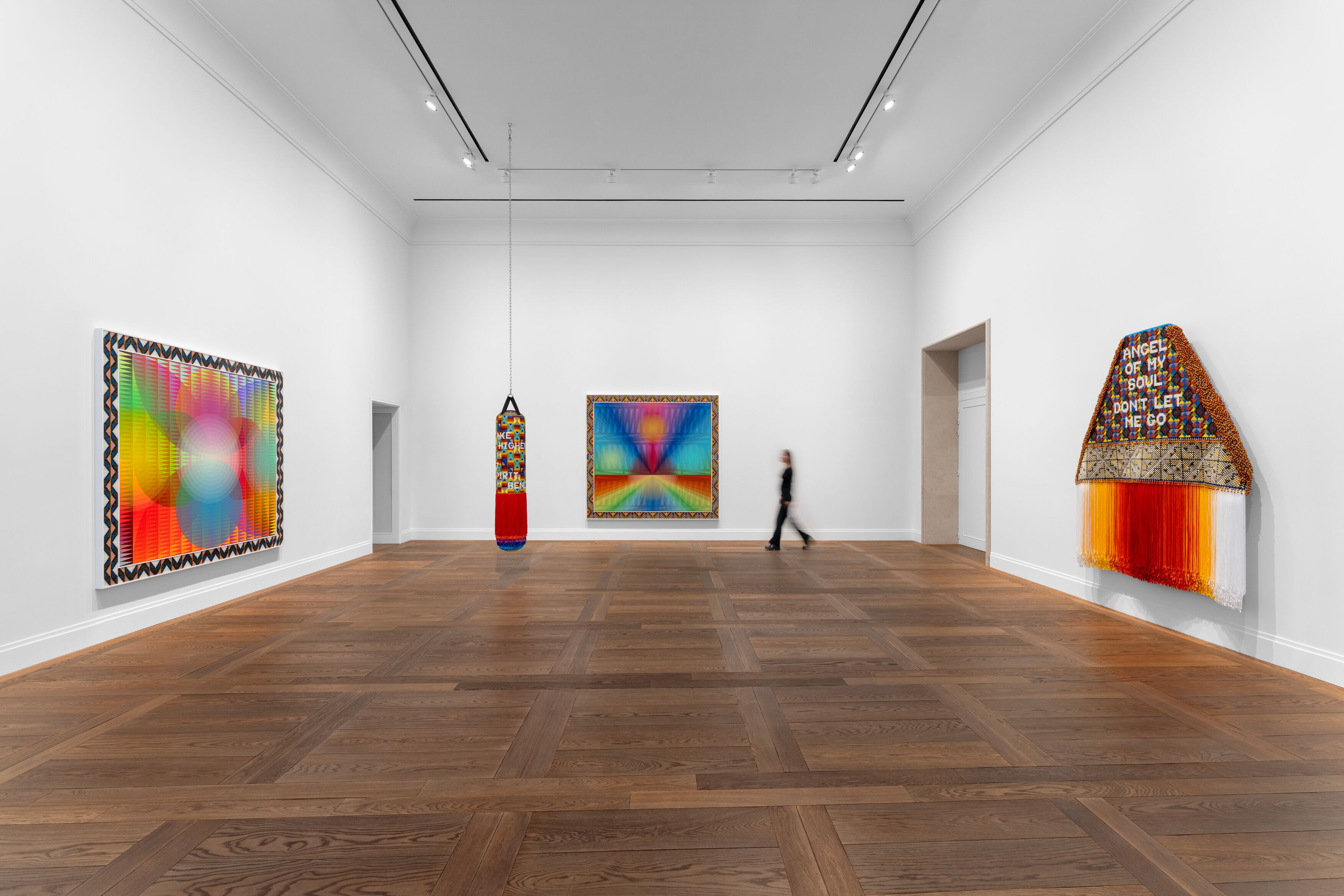 Al piano terra della galleria sono esposti tre dipinti di grande formato incorniciati da un fine e delicato intreccio di perline colorate che ne seguono le forme, come una greca, e una piccola tela più semplice che richiama il sole allo zenit. A fare da contrappunto in sala, due sacchi da boxe interamente ricoperti di perline, anch’essi caratterizzati da motivi ricorrenti alternati a scritte che invitano a seguire la forma del sacco e ad approfondirne il ricamo per comprenderne il significato. “I WANT TO TAKE YOU HIGHER”, “NEVER LET YOUR SPIRIT BEND”: queste le frasi che si leggono su uno dei sacchi. Si crea così un tentativo di negoziazione tra il significato della frase a se stante, quello derivante dal fatto che sia applicata a un sacco da boxe e il suo valore nella vita del singolo o della comunità.