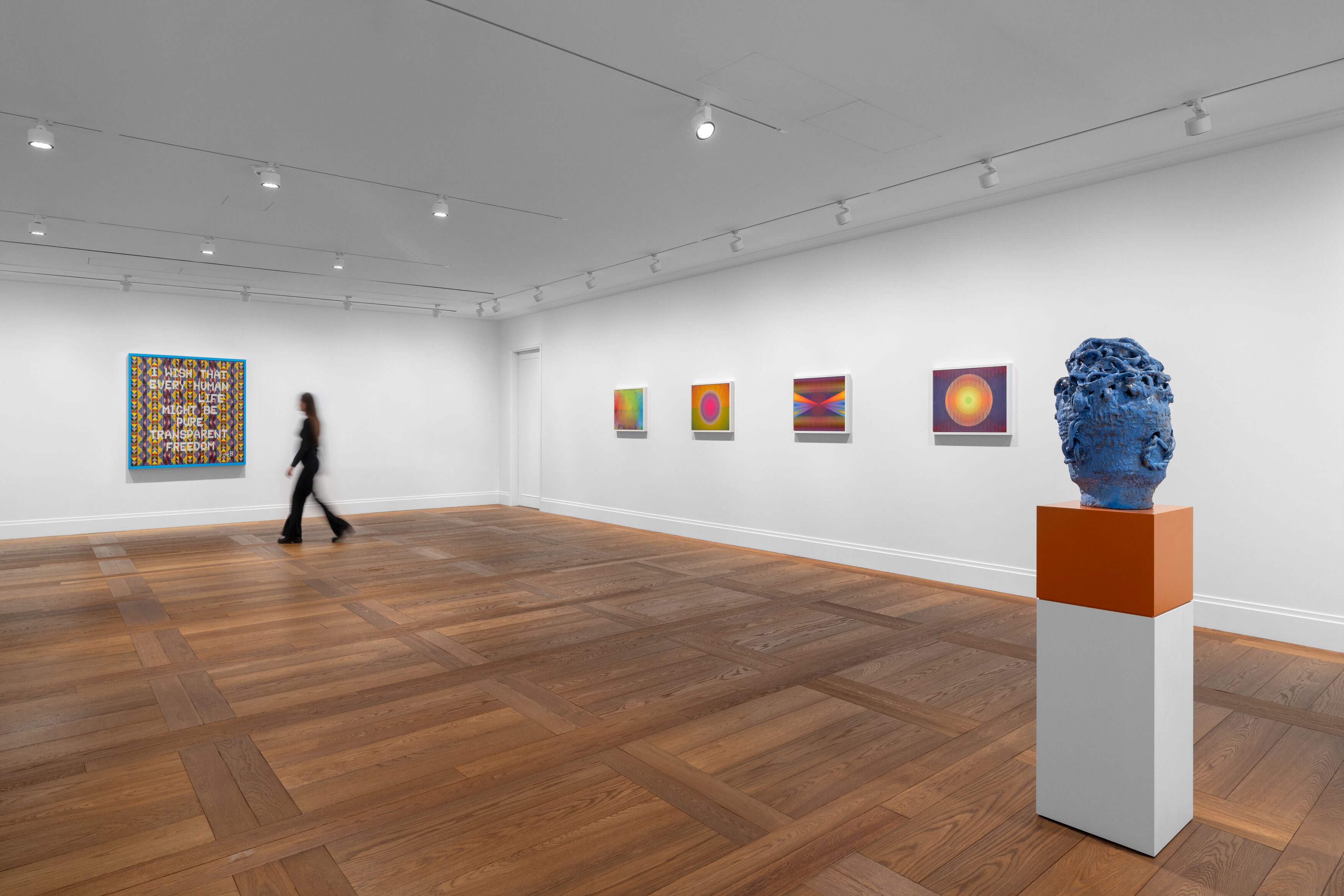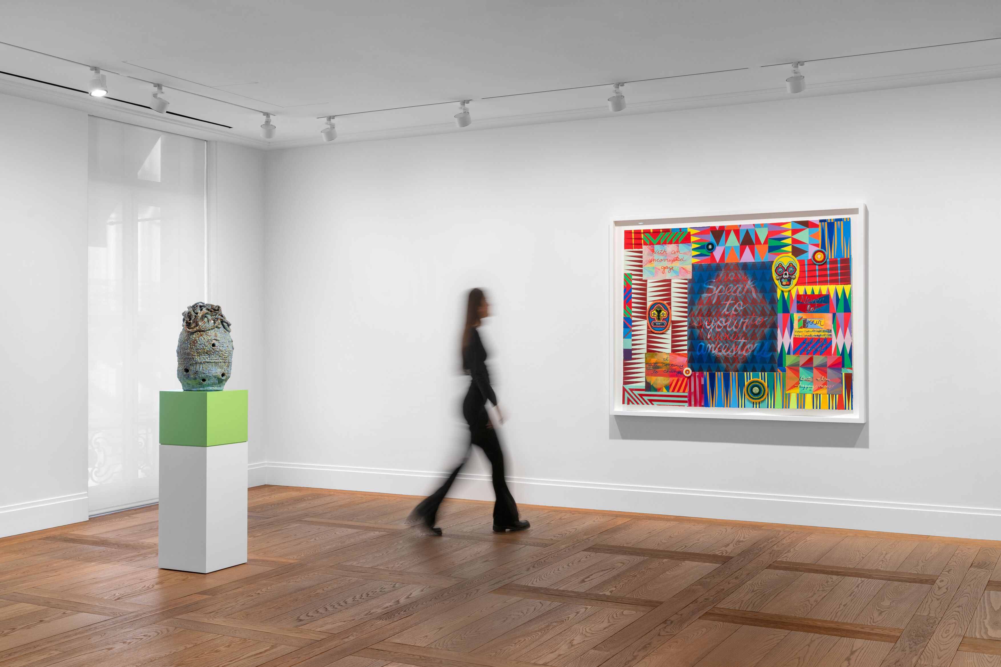 La direttrice di Hauser & Wirth New York, Caitlin Foreht, racconta come la collaborazione tra l’artista e la galleria fosse stata annunciata proprio in questo stesso periodo un anno fa e oggi sia diventata realtà tangibile attraverso dipinti di grandi e piccole dimensioni, collage, ceramiche e nuove opere della celebre serie dedicata ai sacchi da boxe, ai mantelli appesi e ai dipinti uniti a perline. Gibson ha vissuto in diverse città degli Stati Uniti ma anche in Germania e in Corea. Ha inoltre origini Choctaw e Cherokee e questo si riflette nella sua ricerca multidisciplinare, intima ma anche dimostrativa e radicale, in cui indaga la storia americana, le tradizioni indigene, la cultura queer, insieme alla musica popolare, alla letteratura e alla storia dell’arte.