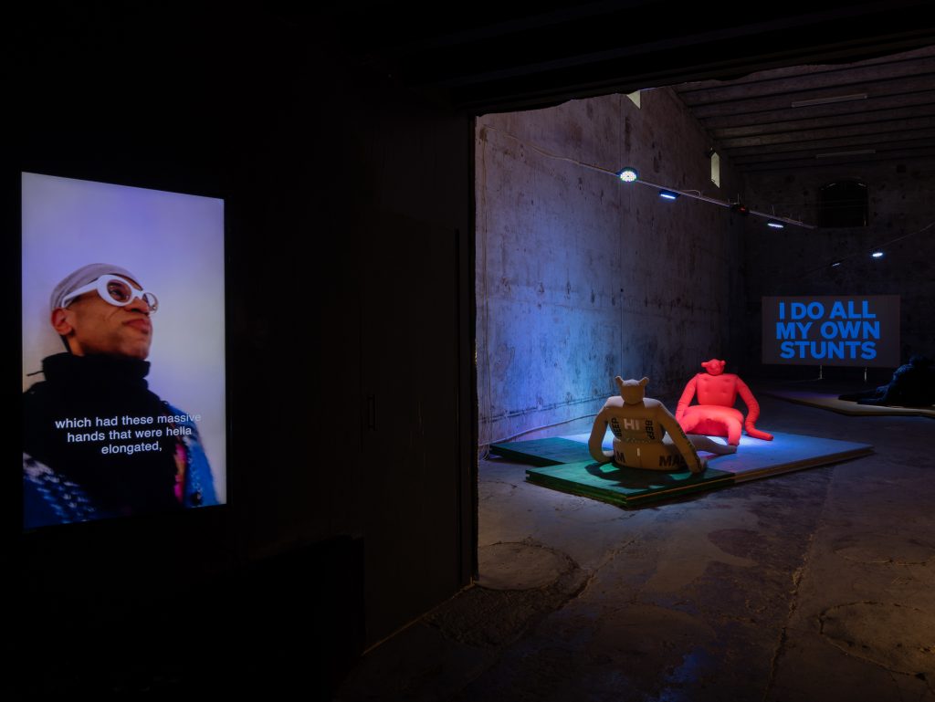 Accoccolati su queste creature post-umane, siamo invitati ad osservare una serie di slogan che sfilano di fronte ai nostri occhi su uno schermo scuro: No war peace, Kiss the future, Sex. Sono queste alcune delle espressioni che si incidono sulle nostre iridi, trasformando l’arrivo degli alieni in una dichiarazione politica: in un tempo lacerato dalle crisi globali e da strazianti genocidi, gli alieni non ci parlano di invasioni post-apocalittiche, ma sembrano chiederci affetto, piacere —anche sessuale— e speranza nel futuro. Da questo punto di vista, è l’essere umano a commettere atti terrificanti, mentre gli alieni ci invitano a mettere un punto all’orrore in corso. L’invasione, qui, non è distruttiva, ma erotica, morbida, relazionale.