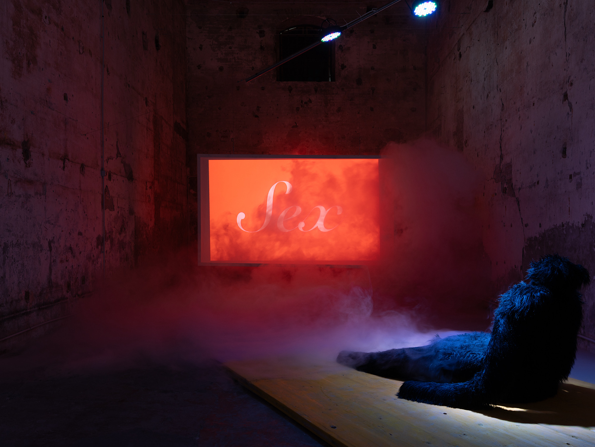Accoccolati su queste creature post-umane, siamo invitati ad osservare una serie di slogan che sfilano di fronte ai nostri occhi su uno schermo scuro: No war peace, Kiss the future, Sex. Sono queste alcune delle espressioni che si incidono sulle nostre iridi, trasformando l’arrivo degli alieni in una dichiarazione politica: in un tempo lacerato dalle crisi globali e da strazianti genocidi, gli alieni non ci parlano di invasioni post-apocalittiche, ma sembrano chiederci affetto, piacere —anche sessuale— e speranza nel futuro. Da questo punto di vista, è l’essere umano a commettere atti terrificanti, mentre gli alieni ci invitano a mettere un punto all’orrore in corso. L’invasione, qui, non è distruttiva, ma erotica, morbida, relazionale.