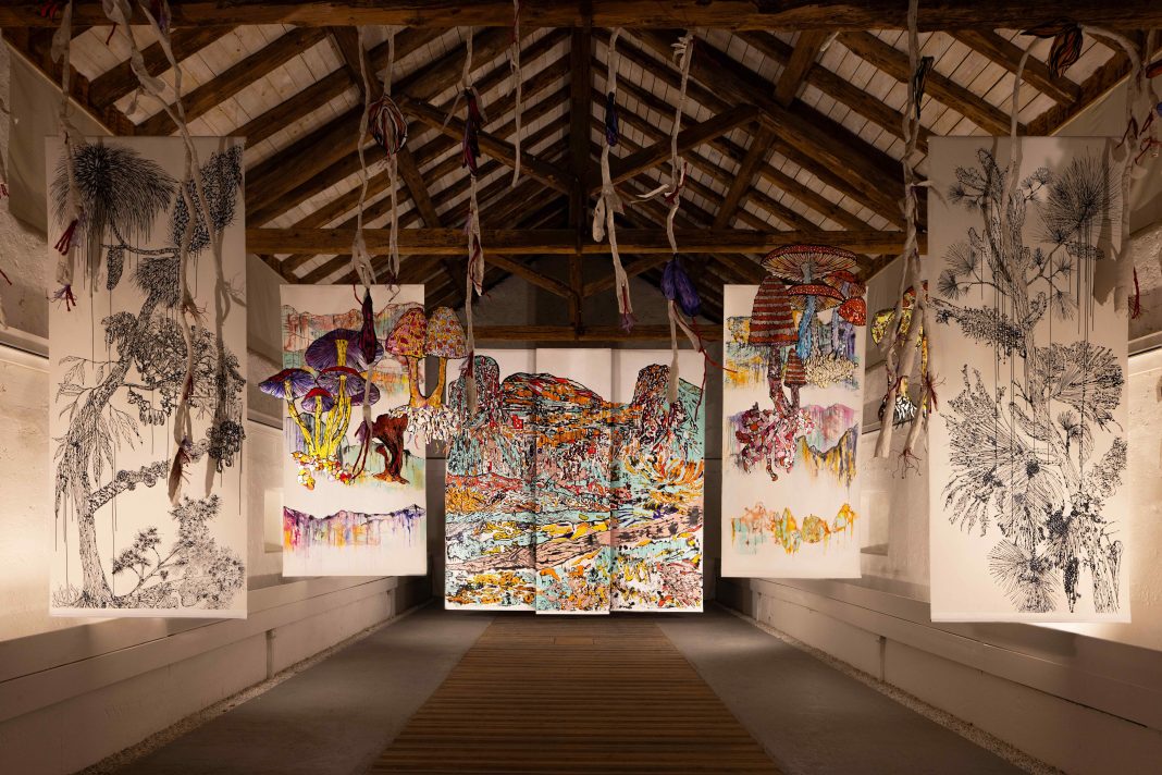Una volta scostato il velo di Maya, qui incarnato da una foresta di faggi in bianco e nero, la realtà si disvela, proiettandoci in un bosco in cartapesta, che piovendo dall’alto ci trasporta direttamente in quel mondo possibile che solo fino a poco fa potevamo immaginare, riprodotto davanti a noi in miniatura. Carapaci dal gusto esotico fluttuano sulle nostre teste come foglie variopinte, funghi e funghetti dai colori psichedelici crescono nel sottobosco ombreggiato di pannelli di carta, su cui si protendono rami e montagne, sovrastati dal monologo ingaggiato dal grande monte riprodotto sullo sfondo, risultato dell’assemblaggio di diversi ghiacciai del Trentino.
