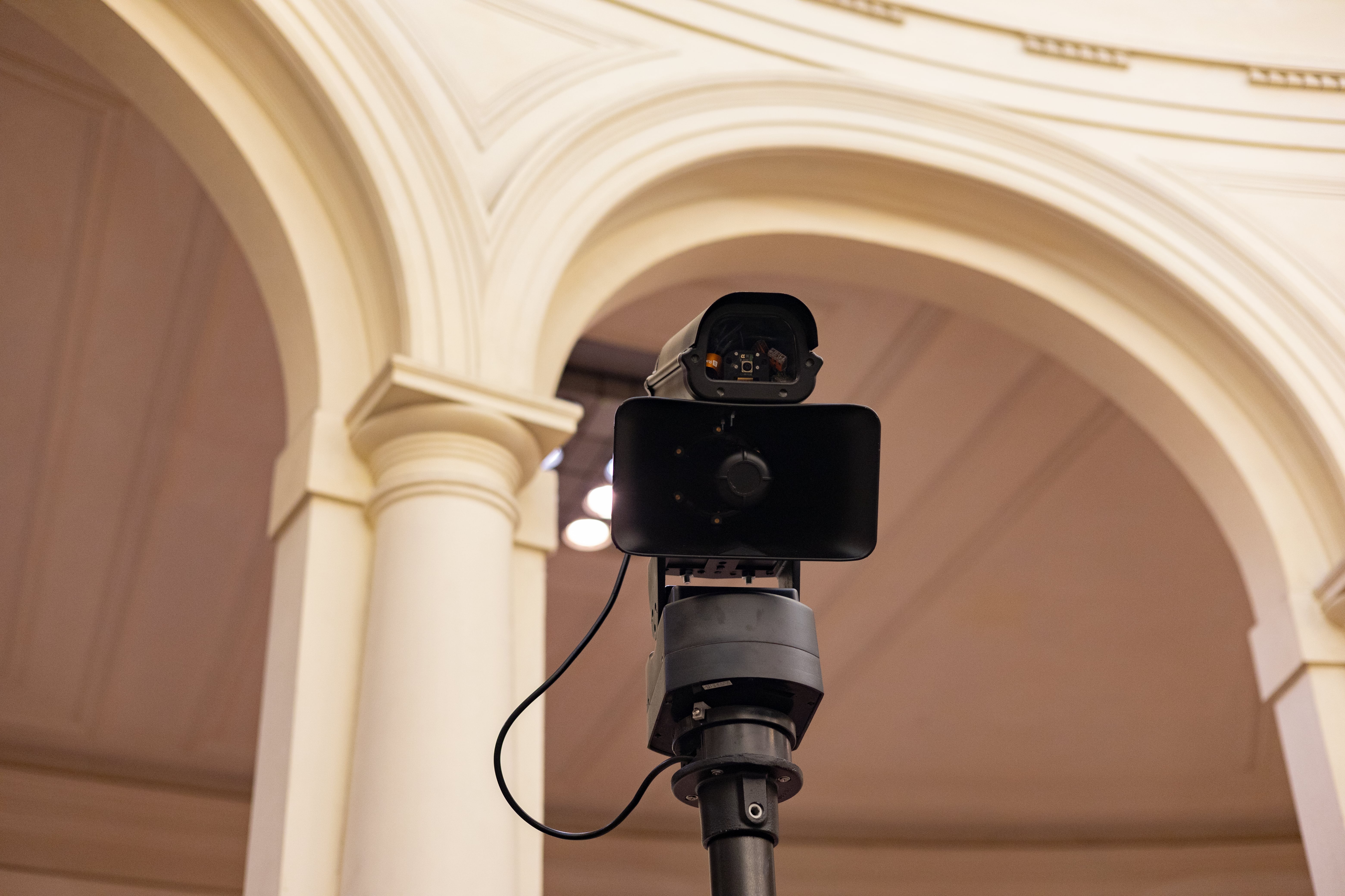 All’ingresso della Biblioteca di Sala Borsa ci accoglie Surveillance Speaker, la prima delle installazioni dell’artista belga, che mette in luce i cambiamenti nel comportamento umano determinati da forme di controllo. Realizzata nel 2018 e successivamente perfezionata grazie ai progressi dell’intelligenza artificiale, l’opera consiste in un altoparlante che, tramite un sistema di IA, racconta vocalmente ciò che accade nell’ambiente circostante, analizzando in tempo reale le immagini catturate da una telecamera posta in alto.
