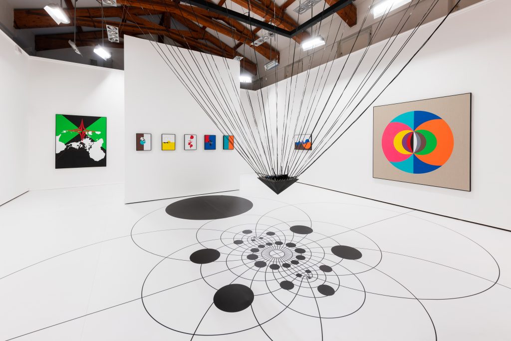 La distorsione a cui i sistemi di comunicazione sottopongono le informazioni che compongono la nostra percezione della realtà è portata all’estremo dall’artista impiegando il software worldsinfigures.com. Il software permette la manipolazione e la sovrapposizione delle 121 mappe, che Roth ha accumulato dal 2018, con bandiere reali o inventate, dando origine ai veri e propri mondi distorti della serie di dipinti in acrilico Strands (2020 – in corso). L’impossibilità della restituzione del dato reale è ulteriormente visibile nel secondo ambiente della mostra, occupato dalla videoinstallazione Skyscapes (2023). Protagonista assoluto è il cielo di Modena, fotografato dall’artista nell’aprile 2023. Inserite in questo video, le immagini sono anch’esse forzate dall’innaturale quadratura dell’area del cerchio e dalla moltitudine di alterazioni tipiche del sistema cartografico.