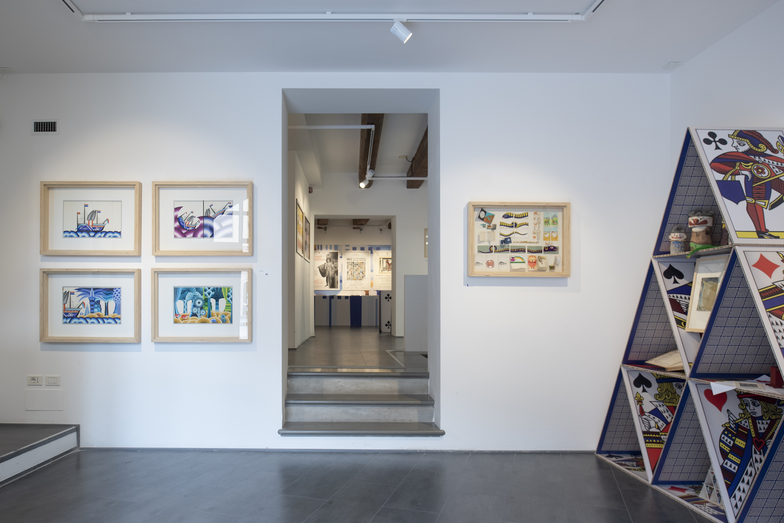 In apertura un castello di carte conserva alcuni preziosi documenti preziosi della biografia di Paola Pallottino, che tra il 1966 e il 1976 iniziò a lavorare scrivendo e illustrando testi per l’infanzia e scientifici per le case editrici Ponte Nuovo, Emme Edizioni, Zanichelli, Marsilio e Sansoni. Della collaborazione con Emme Edizioni sono esposti i volumi Week-End del 1974 e La Barca del 1976, insieme a un raro calendario del 1974 (una serie di animali che si costruiscono di volta in volta nel cambio del mese), e a Bimbo gioca del 1975 (una scatola con un mazzo di carte giganti per costruire castelli).