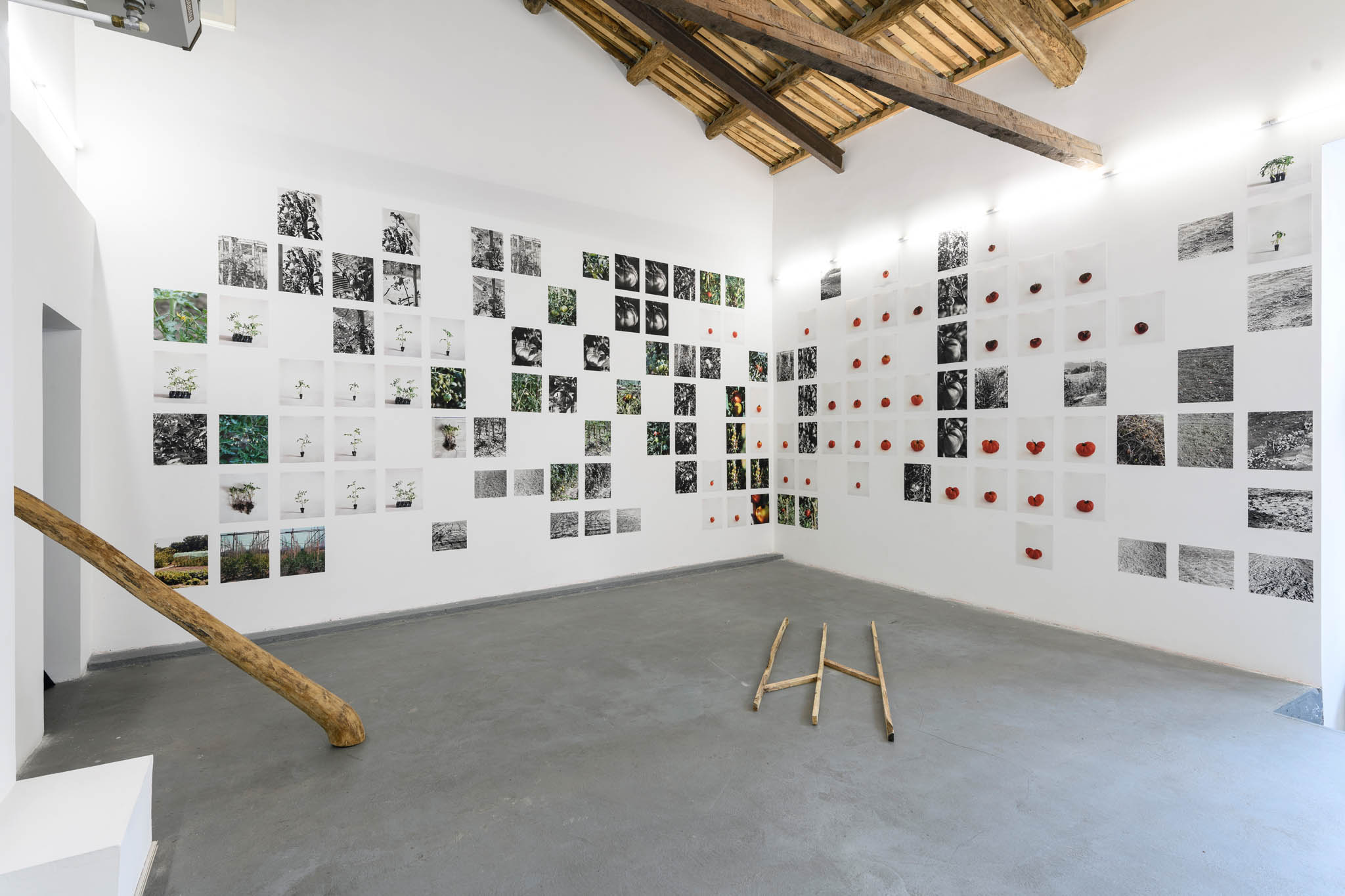 Laura Palau, con l’installazione Flexió de Xilema (Flessione dello Xilema, 2020-2023), riunisce cinque fotografie di alberi (noce, agave, olivo, mandorlo, pino), appartenuti ad altrettanti agricoltori (Seno, Julio, Blas, Nati, Pablo), le cui cornici sono realizzate col legno degli alberi ritratti, amplificate da elementi scultorei ricavati da quegli stessi alberi (sedia/scala, dijeridù, mitjana, il gioco scala di giacobbe, sezioni dell’albero colpito da un fulmine). Attraverso l’ascolto dei piccoli accadimenti, ogni albero esce dall’anonimato, acquisisce spessore e personalità, senza perdersi nella confusione della moltitudine, evidenziandone il precipuo ruolo in una specifica vita; operazione che chiude il ciclo di ogni elemento, senza disperderne la storia e perderne la traccia, lasciandone duratura memoria.