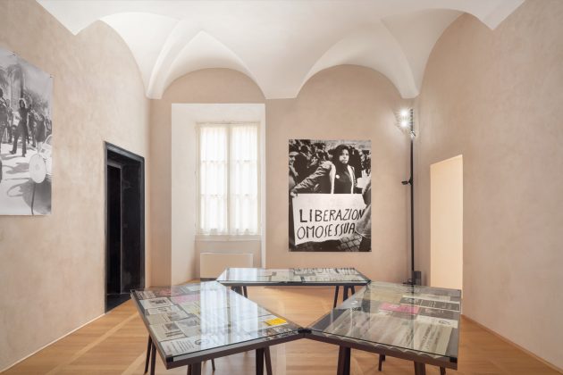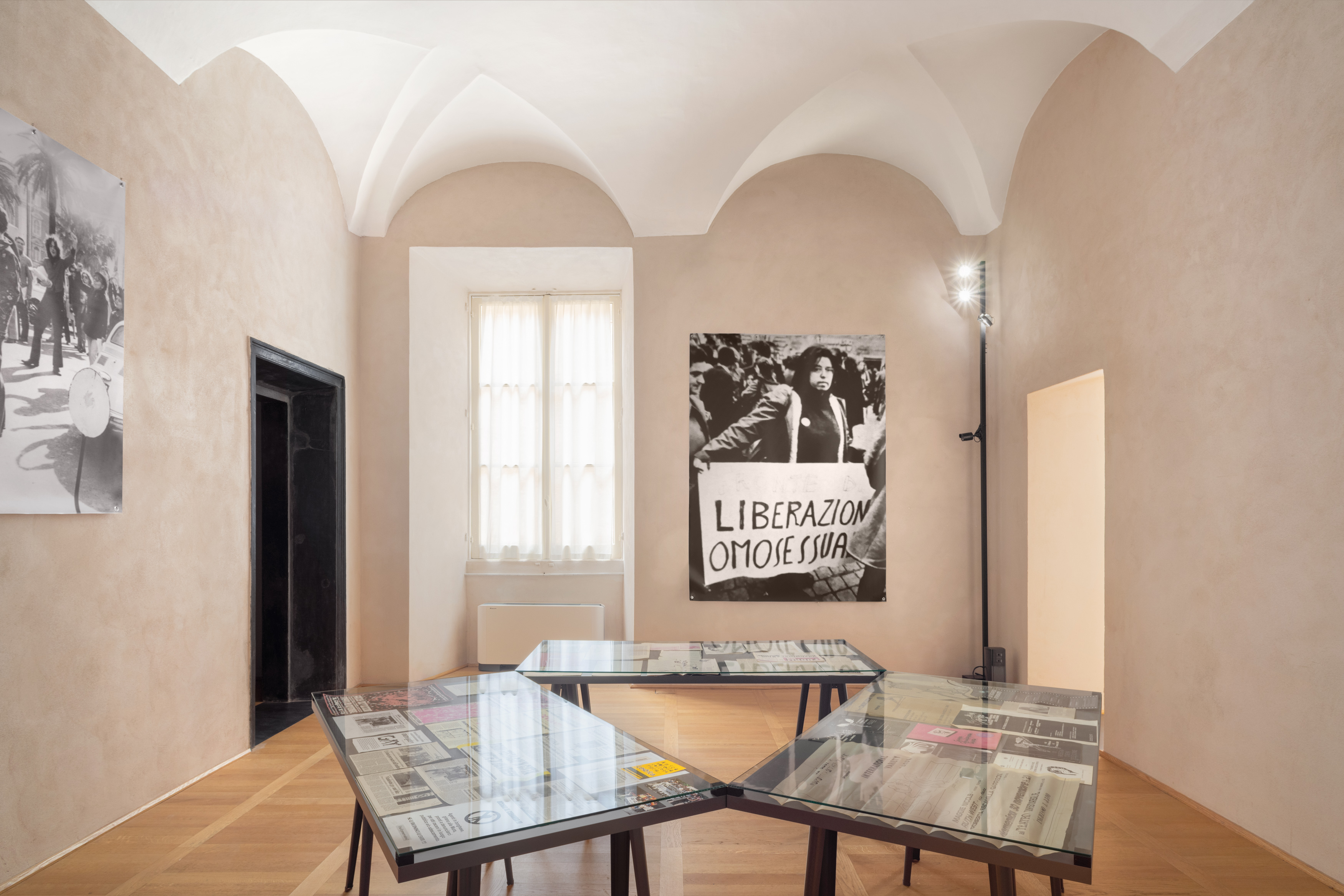 Storiograficamente, la mostra individua quel contesto attraverso materiali d’archivio. Tra questi è interessante dedicarsi ai circa 10 minuti di contributo video, proveniente dalle teche Rai (ma pensa un po’), realizzato pochi mesi dopo gli accadimenti di Sanremo. La scelta di simulare il palco del congresso per la sua proiezione risponde a una scelta evidente in questa mostra: abbinare parallelamente il piano storico a quello puramente emotivo. È come se si volesse “pennellare” quell’atmosfera, riproducendo un’aura tempo-spaziale; anche con l’ausilio delle gigantografie bianco e nero di Mario Mieli, all’esterno del Casinò di Sanremo. O della scrittrice Françoise d’Eaubonne affacciata sul palco del congresso, che a guardarla col naso in su è come se cercasse ancora il suo pubblico. Intanto, sotto il palco, lunghe tavolate ordinatamente rispolverano articoli, incrociando in modo diacronico quel momento specifico agli anni a venire.