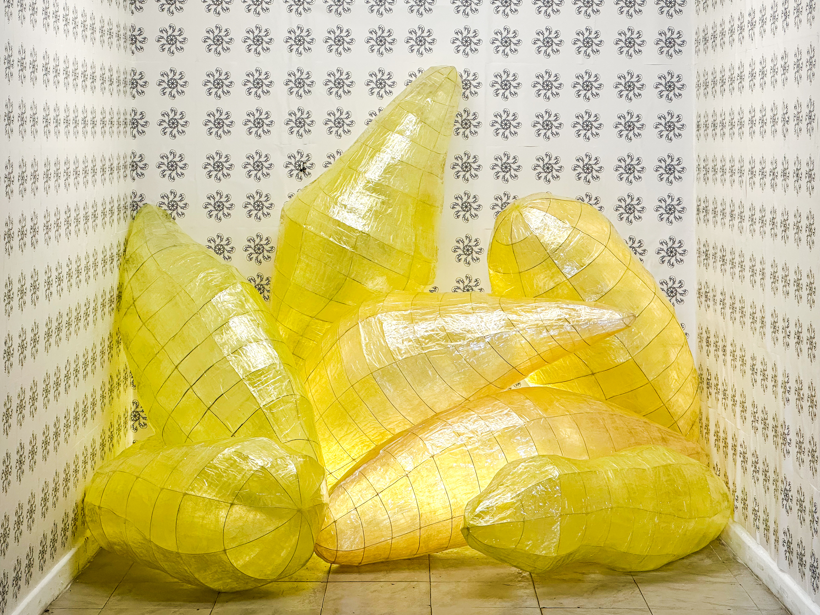 Al centro invece, le crisalidi di Fazio si presentano, secondo un’estetica scultorea, innaturali nelle dimensioni e nelle forme. Fragili, instabili e inabitate, esse sono sinonimo dell’incompletezza individuale, di un vuoto non soltanto interiore e psicologico, bensì un vuoto di tipo contenutistico, provocato dall’alienazione e riferito a ogni individuo al quale viene suggerita una riflessione sulla propria collocazione nella società e sulla propria consapevolezza.