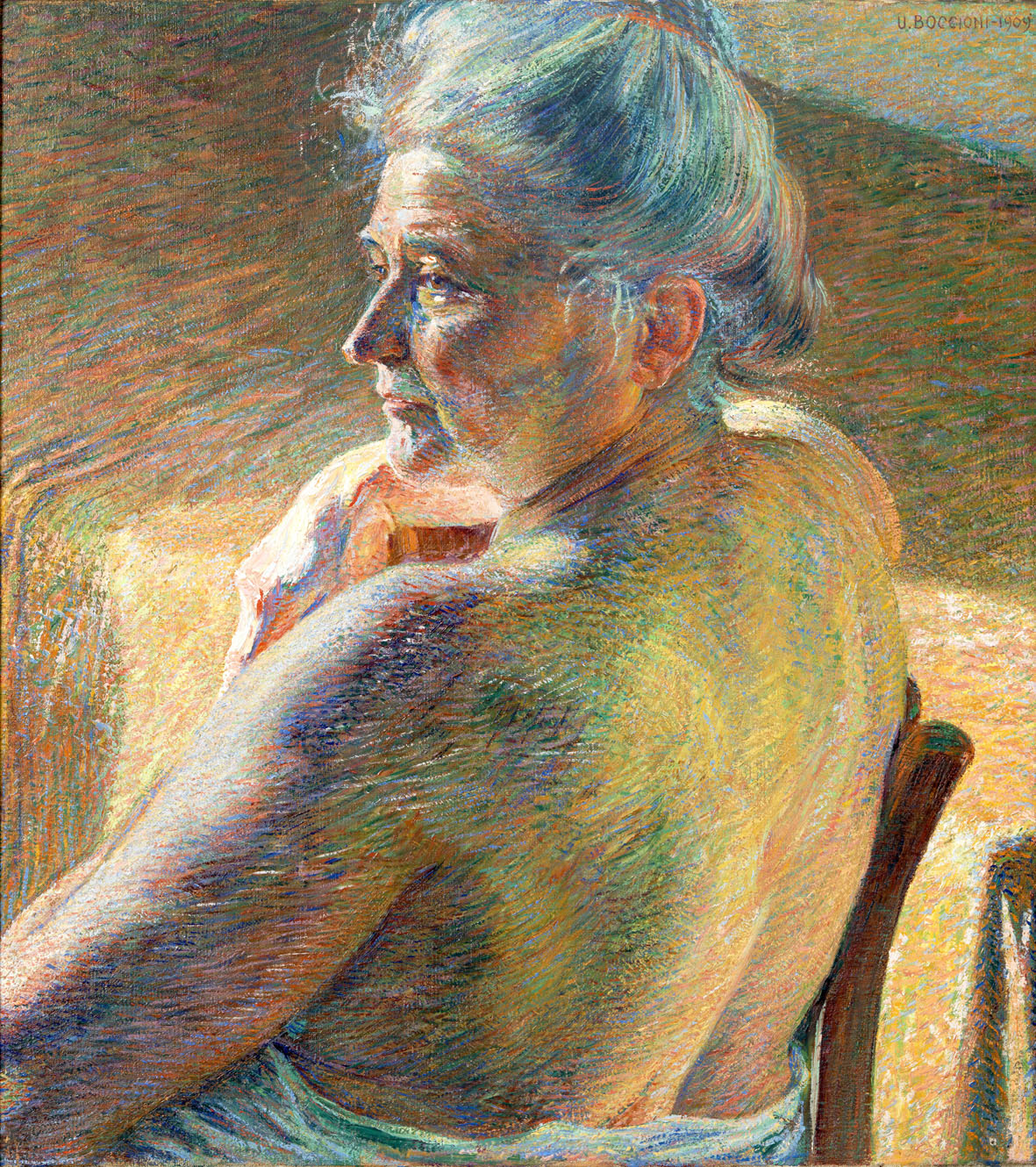 Il Chiostro (in basso, a sinistra, ben leggibile “Boccioni-Padova-1904”), è esemplare dell’attenzione per il farsi dell’opera attraverso momenti stilistici successivi, come pare rivelare il “ritocco divisionista” sul prato operato forse a Milano. O, sempre del ’04, il Ritratto della sorella, dove il bianco della camicetta contrasta nella sua ruvida matericità con lo sguardo languido di lei. Si arriva poi al 1909 del Ritratto di gentiluomo, la cui posa convenzionale è desumibile dalla committenza, senza con ciò privare il dipinto di accattivanti giochi cromatico-luministici. Sempre del ’09 Nudo di spalle (Controluce), ritratto della madre nel quale i filamenti di colore sono segno della lezione balliana ma anche risultato di un apprendistato che ormai si affranca dalla lezione del maestro per acquisire confidenze più strette appunto con i “controluce” che preludono a virtuosismi del divisionismo boccioniano di stampo futurista. La madre è soggetto ricorrente e lo sarà ancora in un dipinto e, soprattutto, in un celebre bronzo, l’Antigrazioso, del 1912-13, non presente.