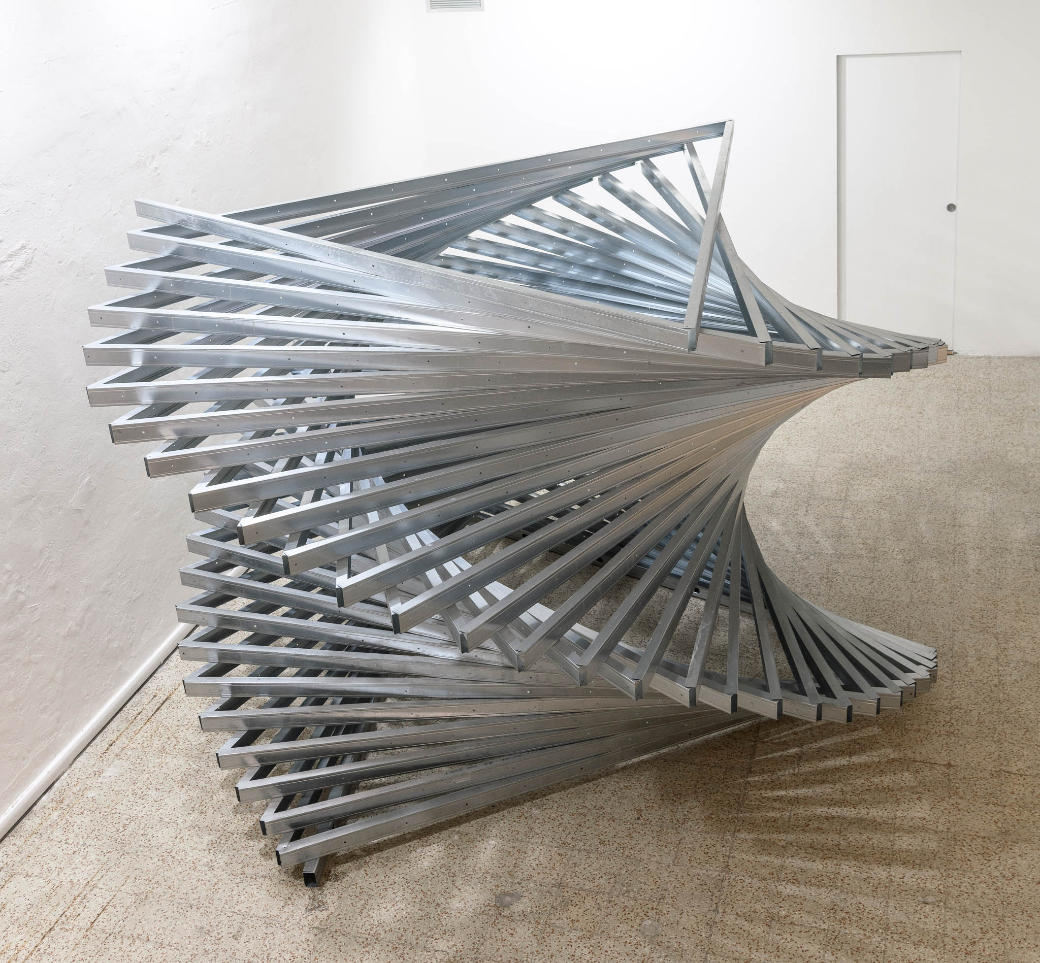 Stillness (2024) è un’enorme installazione dalla forma a spirale, costituita di montanti in acciaio, che svetta per dimensioni e geometrie in mezzo alla sala che la ospita, ergendosi con moto ascensionale. Con quest’opera site specific, Vivacqua riempie l’ambiente e, ricostituendone i confini, attua un’operazione meta-scultorea, in totale antitesi con la concezione più classica della scultura di stampo monumentale.