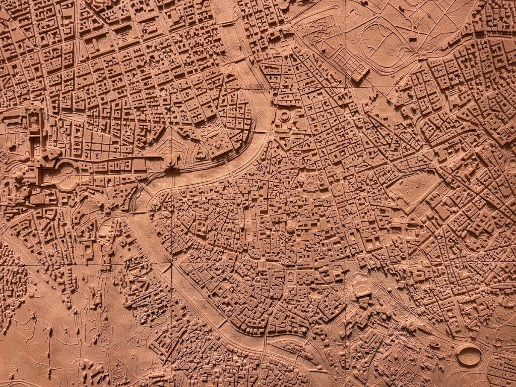 La mostra si conclude con Il DNA di Roma, dominata dal monumentale modello fisico dell’intero Comune in scala 1:7500. Il plastico (ovviamente) in terracotta, di 7×7 metri realizzato da Marco Garofalo con progetto visivo di ULTRA, è concepito come superficie di proiezione per dati e mappe, sintetizza efficacemente i contenuti del percorso, rendendo leggibili fenomeni complessi direttamente sull’impronta della città.