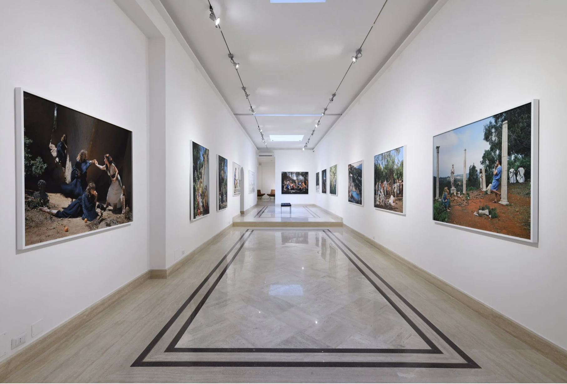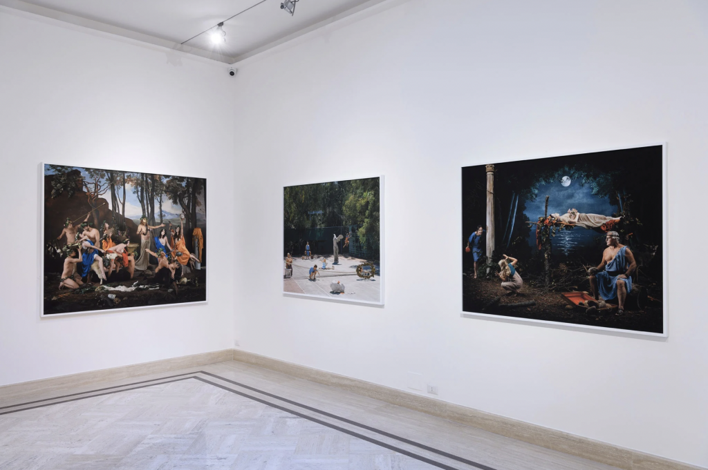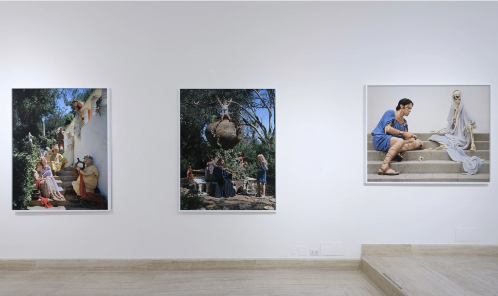 Eleanor Antin, figura chiave emersa dai movimenti dell’Arte Concettuale degli anni Settanta, è oggi una delle artiste femministe più importanti del mondo, attiva nel campo dell’identità, del genere, dell’autobiografia, della classe e delle strutture sociali che sa trattare con abile arguzia e umorismo. L’opera “Roman Allegories”, esposta a Roma per la prima volta, fa parte di un’iconica trilogia – “Historical Takes di Antin” (2001-2008) – che coniuga l’amore per il mondo antico e la pittura da salotto del XIX secolo per fornire una dura e aspra critica alla società contemporanea e alle dinamiche di potere. Dodici fotografie, riccamente saturate e grandi fino a tre metri compongono la serie realizzata con il coinvolgimento di un cast di oltre cento amici e modelli che, in costumi romani, si aggirano tra le presunte rovine dell’Impero Romano. La serie è, in verità, stata interamente scattata nel quartiere di La Jolla, a San Diego. Antin, associando La Jolla all’antica città di Pompei – entrambe così ricche e sotto la costante minaccia della natura – ha dato vita a dei veri e propri tableaux con cui, attraverso l’allegoria e la satira, fa emergere un malinconico senso di perdita provato dai personaggi che vivono in un impero in declino, situando al contempo le loro azioni e i loro eventi nel mondo contemporaneo. La Jolla non è dunque un semplice sfondo: le colonne spezzate, le statue classiche e i vasi vuoti all’interno di una natura tanto seducente quanto pericolosa, di giardini lussuosi e di campi da tennis e ville esclusive contrappongono allo sfarzo e alla ricchezza eccessiva della cultura locale la potenziale rovina che si profila all’orizzonte.