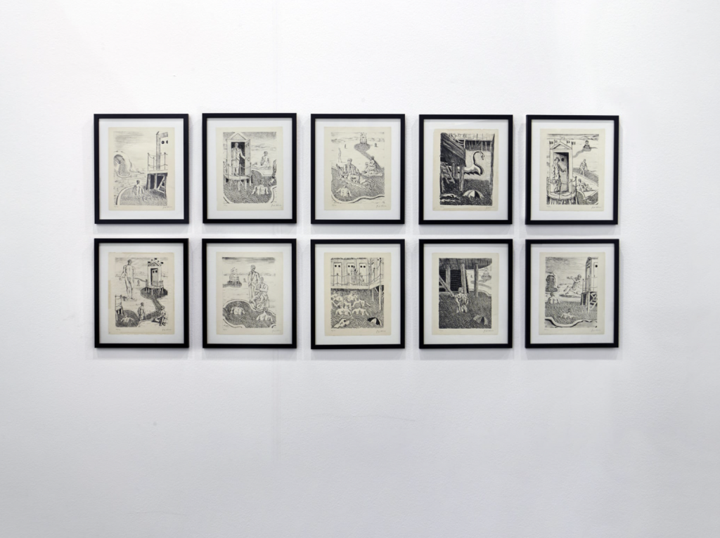 Prevalgono, nella serie, le narrazioni femministe, con personaggi femminili ritratti, divertiti mentre partecipano a scene di eccitazione baccanale, attraverso cui Antin riconosce e suggerisce l’inevitabile trappola che attende queste donne. In “Alice’s Dream”, le ragazze che pendono dall’albero, avvolte in vesti arancioni, sono le stesse che festeggiano in “The Triumph of Pan (after Poussin)”. A dialogare con queste allegorie romane, parimenti per la prima volta esposte a Roma e rivelatrici di una visione intima e senza precedenti del processo creativo di uno dei pittori più influenti di tutti i tempi, sono le mitologie di Giorgio De Chirico, padre fondatore della Metafisica che, dipingendo paesaggi onirici di piazze e portici classici popolati da manichini spettrali, ha affascinato l’avanguardia francese degli anni Dieci e ha ispirato profondamente i surrealisti Breton, Dalí e Magritte. L’immaginario di De Chirico, che con la prospettiva distorta e l’ombra lunga e minacciosa emana un senso di malinconia, attinge alla filosofia e alla mitologia del suo paese natale, la Grecia. Come nelle “Mitologie” del 1934, con statue greche, centauri e mostri marini, oltre che l’artista stesso vagante in un mondo puramente teorico. Le dieci litografie sono accompagnate dagli scritti del poeta e romanziere Jean Cocteau, che ammirava profondamente l’artista e definiva la sua opera un “mistero laico”, un luogo in cui enigma e mistero convergono con la chiarezza delle forme.
