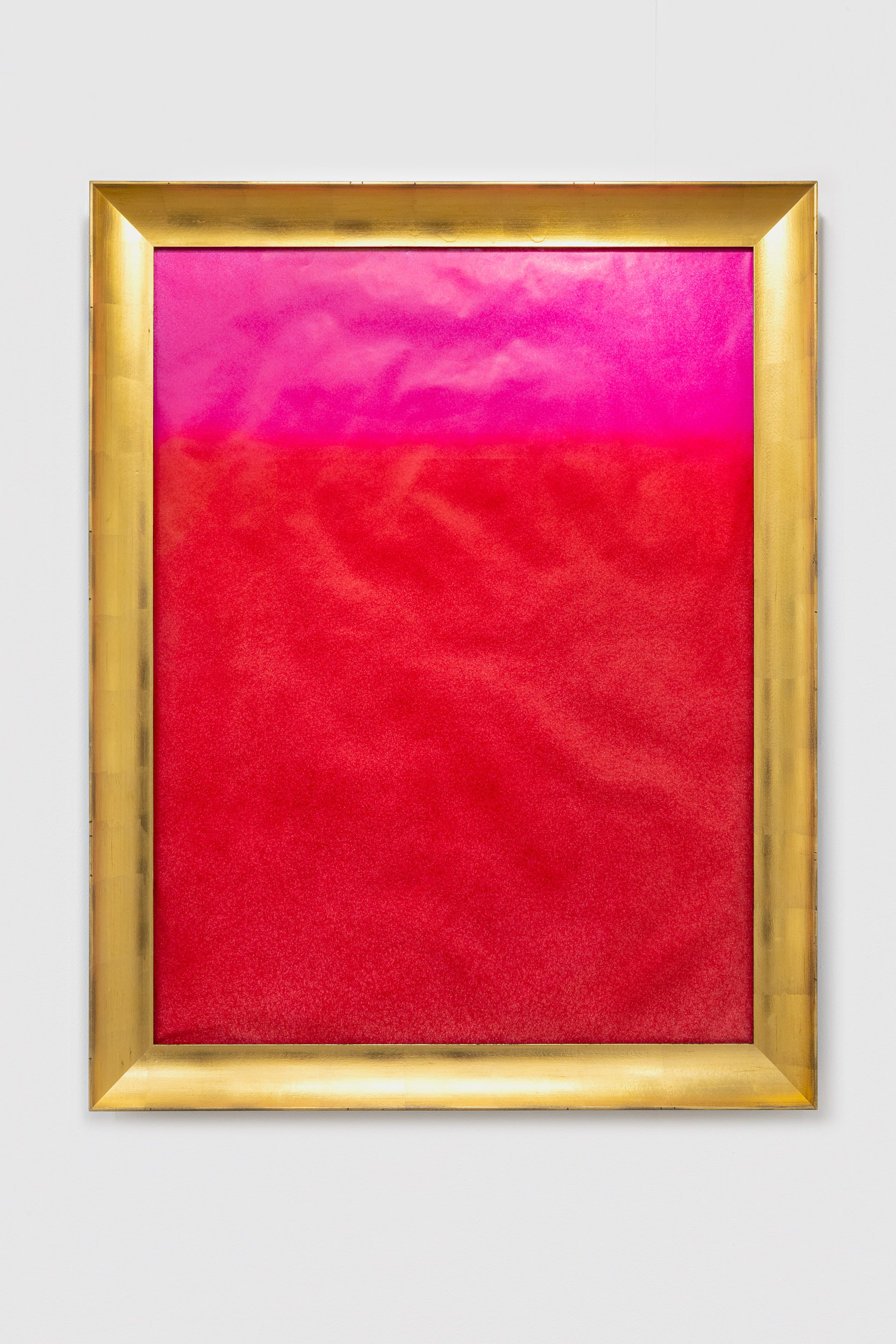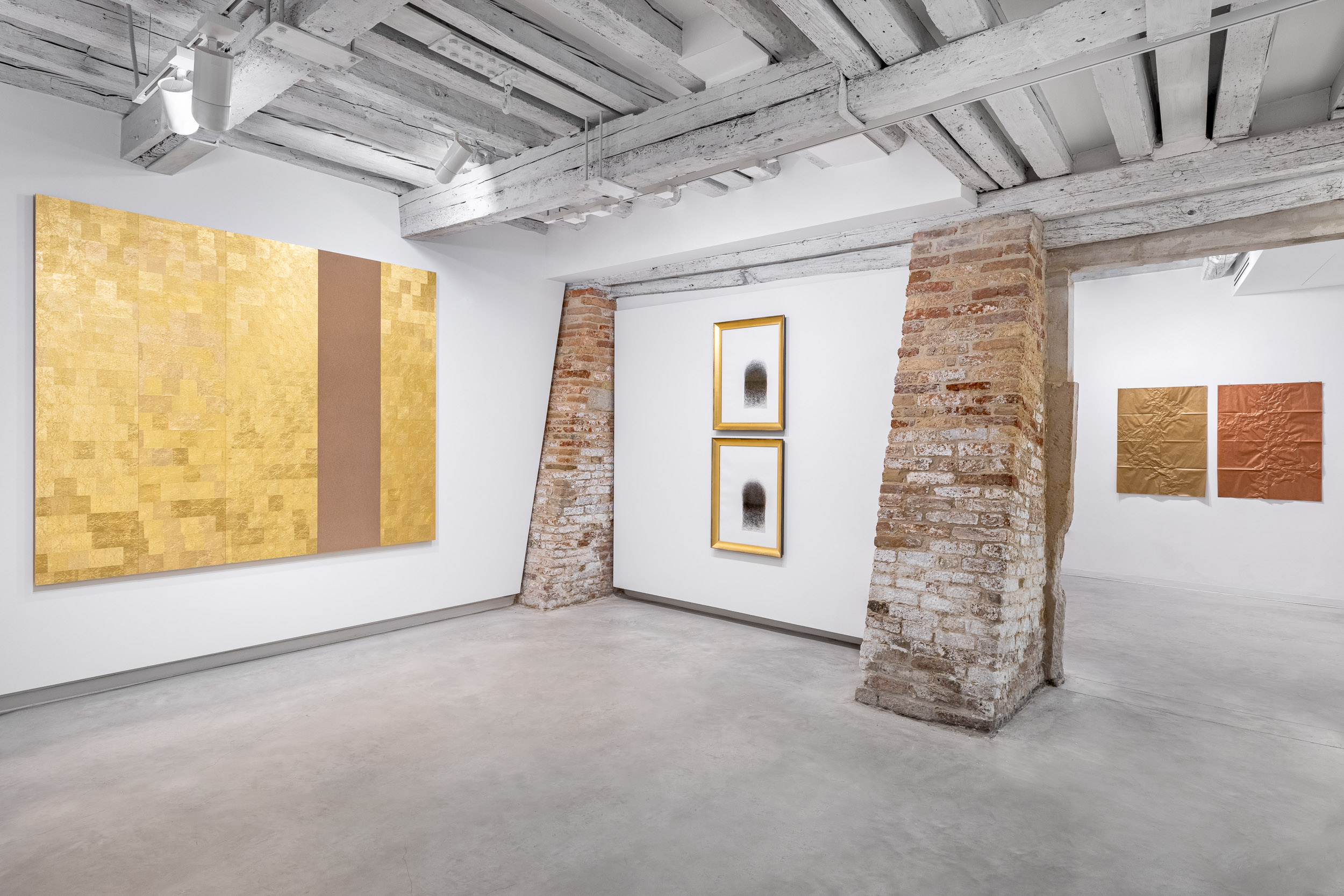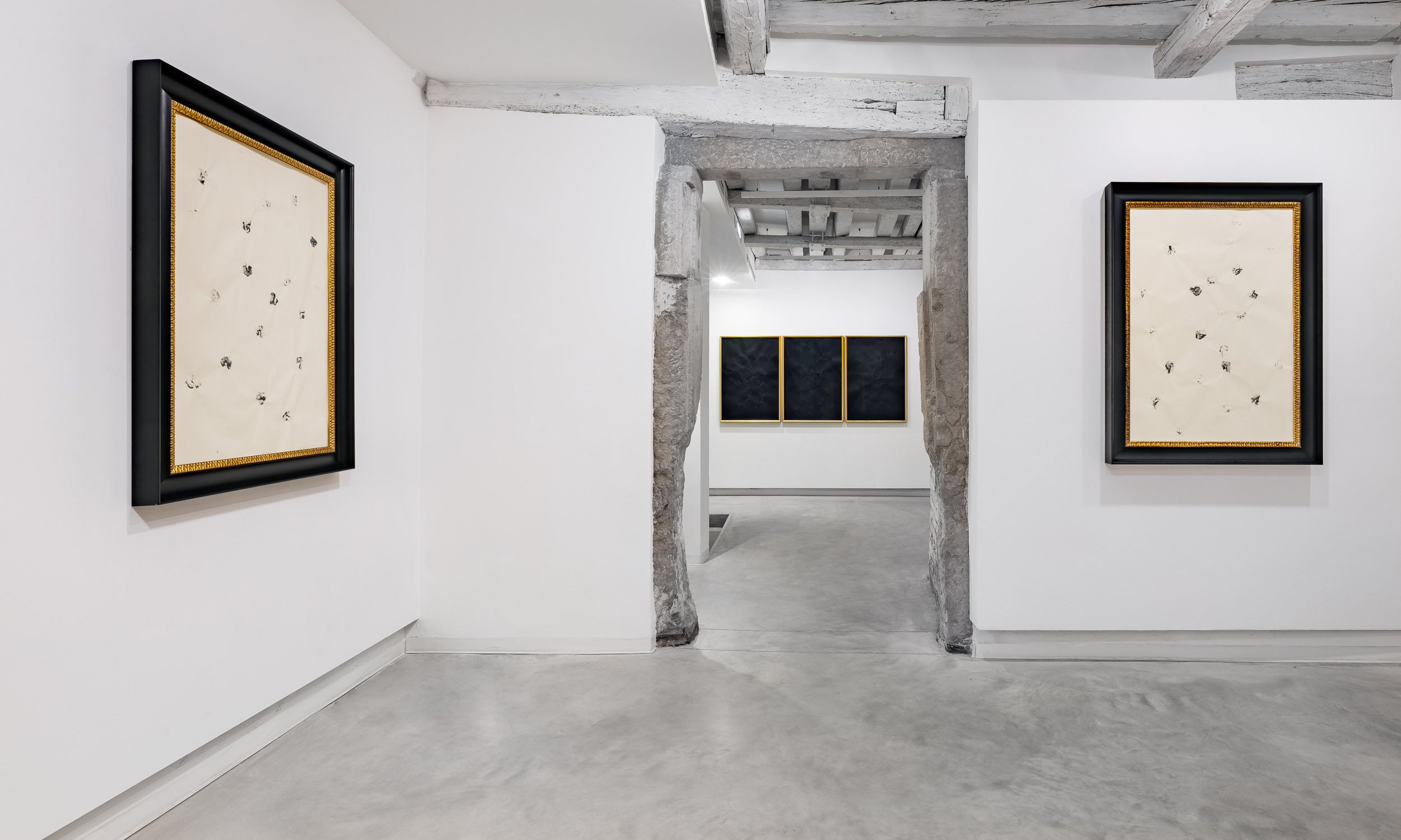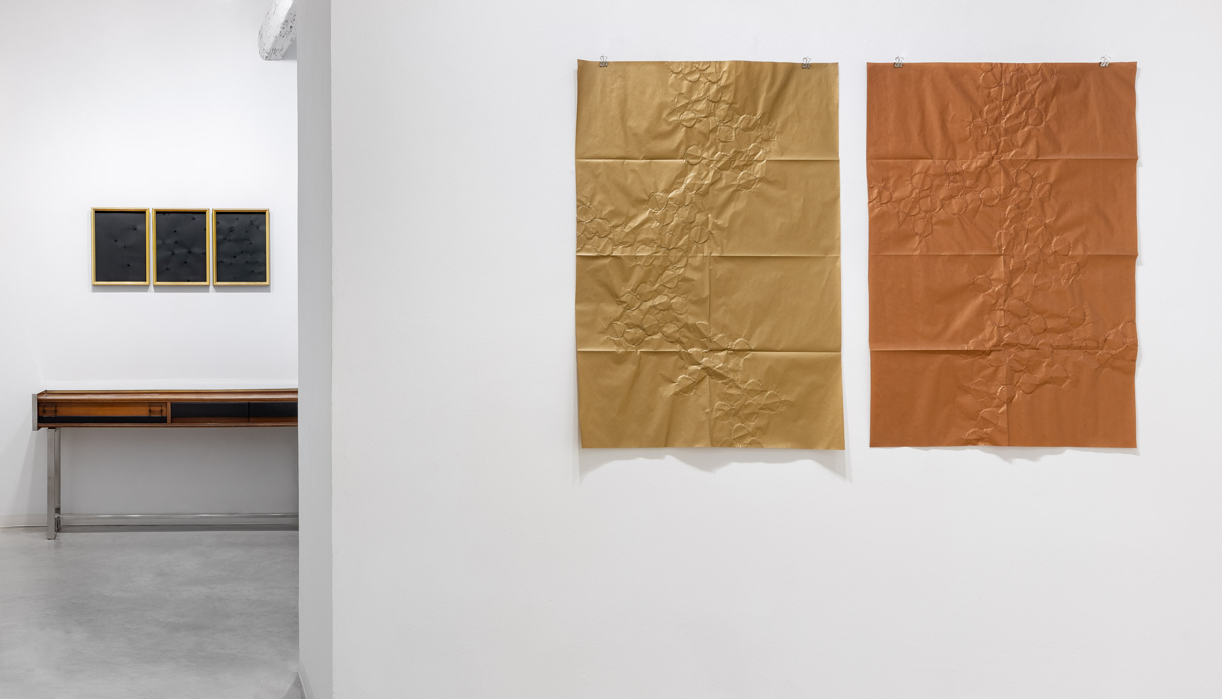 “Sacro e Profano” sono i due aggettivi che descrivono il rapporto di Serena Fineschi con la pittura, rispetto sacrale e rottura dei canoni tradizionali. L’artista, nata a Siena nel 1973, lavora tra la sua città natale e Brussels. Dopo la sua formazione all’istituto d’arte Duccio di Buoninsegna, ha poi proseguito i suoi studi in Storia dell’Arte Contemporanea all’Università di Siena. Il rapporto con i grandi maestri, in particolare del Trecento, è fondamentale per la sua ricerca artistica e viene affrontano in maniera non convenzionale. Il suo intento, come lei stessa dichiara, è quello di «insultare e consacrare, profanare e benedire, turbare e rassicurare. Subire». Ecco allora che nel percorso espositivo nel main space della galleria troviamo una Maestà (Annunciazione) composta con gli incarti dei Ferrero Rocher, che richiamano l’oro dei dipinti medievali, o Disegno di ogni dispetto (La Battaglia di San Romano), ottenuta con il gesto dissacratorio di sputare pezzi di carta Canson nera sulla tela, fino ad arrivare a maestri più contemporanei, come Rothko, a cui fanno riferimento la serie di opere nell’ultima sala, Ingannare l’attesa, realizzate con penna bic.