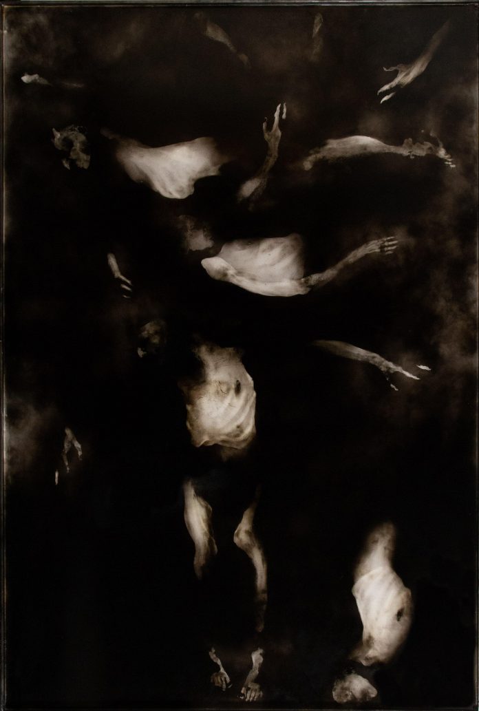Sant’Antonio da Padova del Sassoferrato e collaboratore, incorniciato da una ghirlanda di fiori di stampo fiammingo, brilla di luce ascetica e va a confrontarsi con il trittico di Manfredini Resurrezioni e Angelo in cui le sagome sembrano oscillare nel vuoto per arrivare a una redenzione. Il calco dell’artista rappresenta l’Umanità che da buio si fa luce, così come il volto di Santa Cecilia del Sassoferrato, sospesa tra preghiera e lettura, sullo sfondo di un paesaggio e di una natura morta nitidi, svela il suo martirio, confrontandosi nuovamente con Manfredini nel trittico Senza titolo, anch’esso vicino all’idea di supplizio, di un corpo deformato e crocifisso tendente all’eterno e alla salvezza.