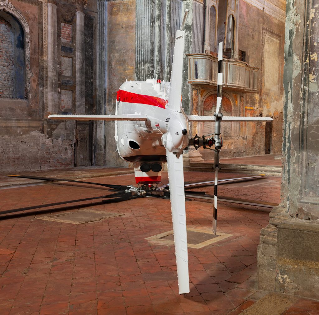 «Riuscire a realizzare quest’opera è straordinario per me. La sensazione di entrare in contatto con qualcosa di così grande e di percepire davvero il mio potere, il nostro potere di posizionarlo sotto sopra, è un sentimento soddisfacente di essere vivi», ci ha raccontato l’artista. A helicopter upside down mette in scena un ribaltamento dell’immagine dell’elicottero sospeso in aria, in volo, ancorando piuttosto le pale al suolo della chiesa, quasi fossero radici.