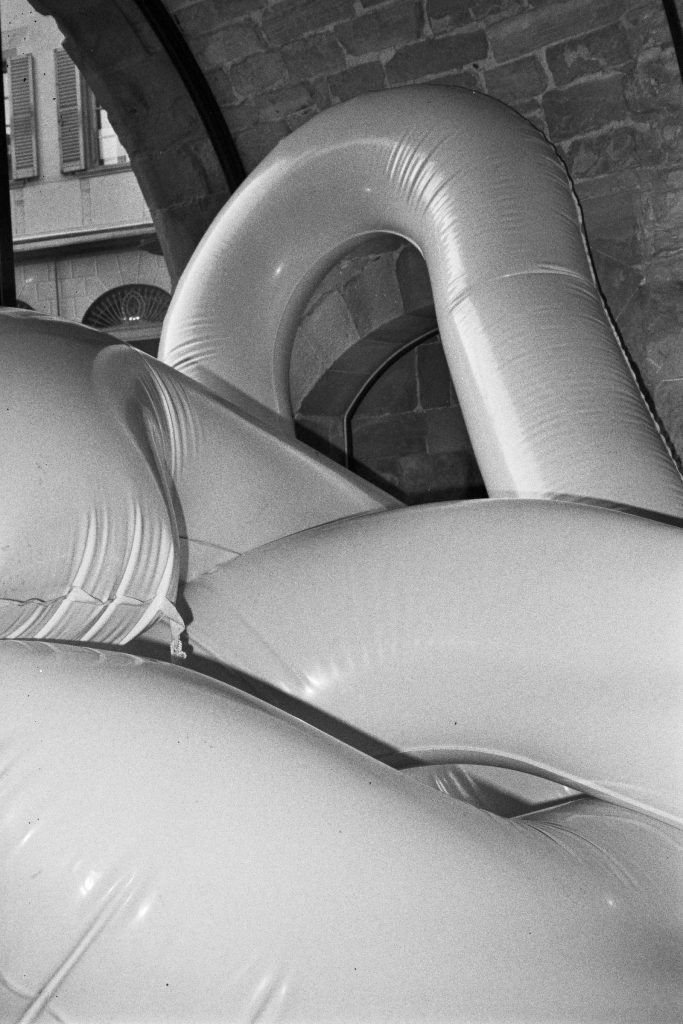 Il tentacolo rosso è collegato ad una grossa scultura inserita sotto la volta interna. Sopra di essa sono riportate scritte a penna, numeri, disegni. La riflessione sulla forma porta a riflettere sull’elemento gonfiabile e la sua funzione: perché è inserito in un luogo storico? Cosa ci fa sotto una volta? cosa sono quelle scritte? L’altra installazione è collocata nella vetrina che dà sulla piazza e consiste in una serie di tubi gonfiabili bianchi attorcigliati. La composizione che ne risulta sembra quasi compressa nello spazio ristretto tra la vetrina e il muro in mattoni. Il rapporto non mediato con le opere consente a ognuno di interpretare la mostra in maniera diversa. Verrà voglia di toccare quelle superfici lisce, di camminare in mezzo a strutture che riportano la mente all’infanzia. Il ruolo sociale dei passanti sarà analizzato in relazione alla percezione che ognuno avrà dei gonfiabili, sia da un punto di vista decorativo ed estetico che da un altro legato alla loro funzionalità.