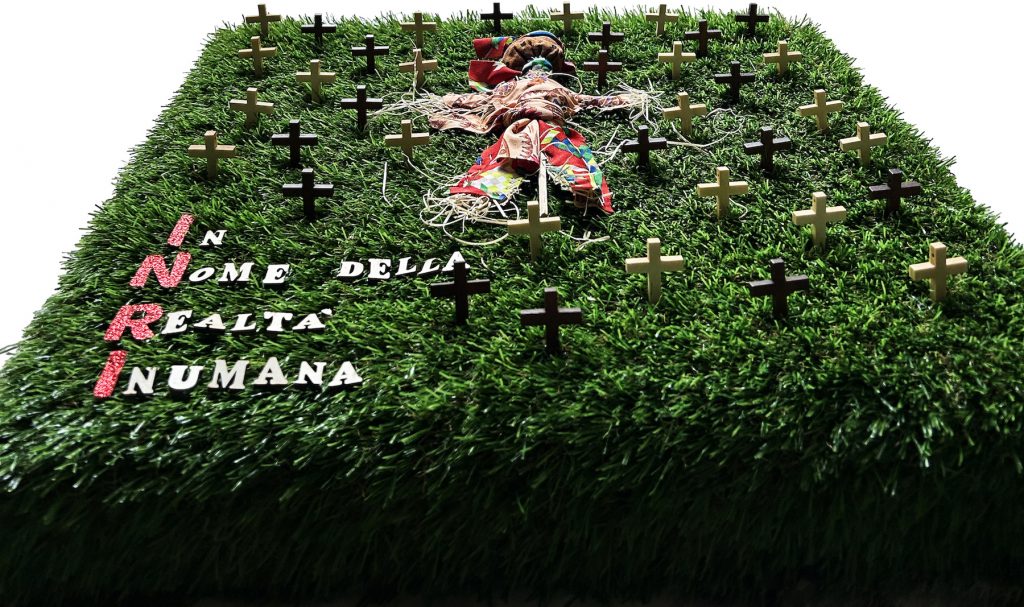 Realizzato con indumenti dismessi, paglia e oggetti di recupero su una struttura a forma di croce, è un avatar statico della presenza umana e allo stesso tempo un amuleto di protezione per delimitare il proprio territorio e proteggere il raccolto, guadagnato con duro lavoro. Lo spaventapasseri sorveglia i campi dalla semina fino al momento cruciale della raccolta autunnale. Nonostante l’aspetto perturbante, oltre l’apparenza è una figura innocua, e per i curatori della mostra è letta come un archetipo di intervento non violento, ma allo stesso tempo determinato e difensivo.