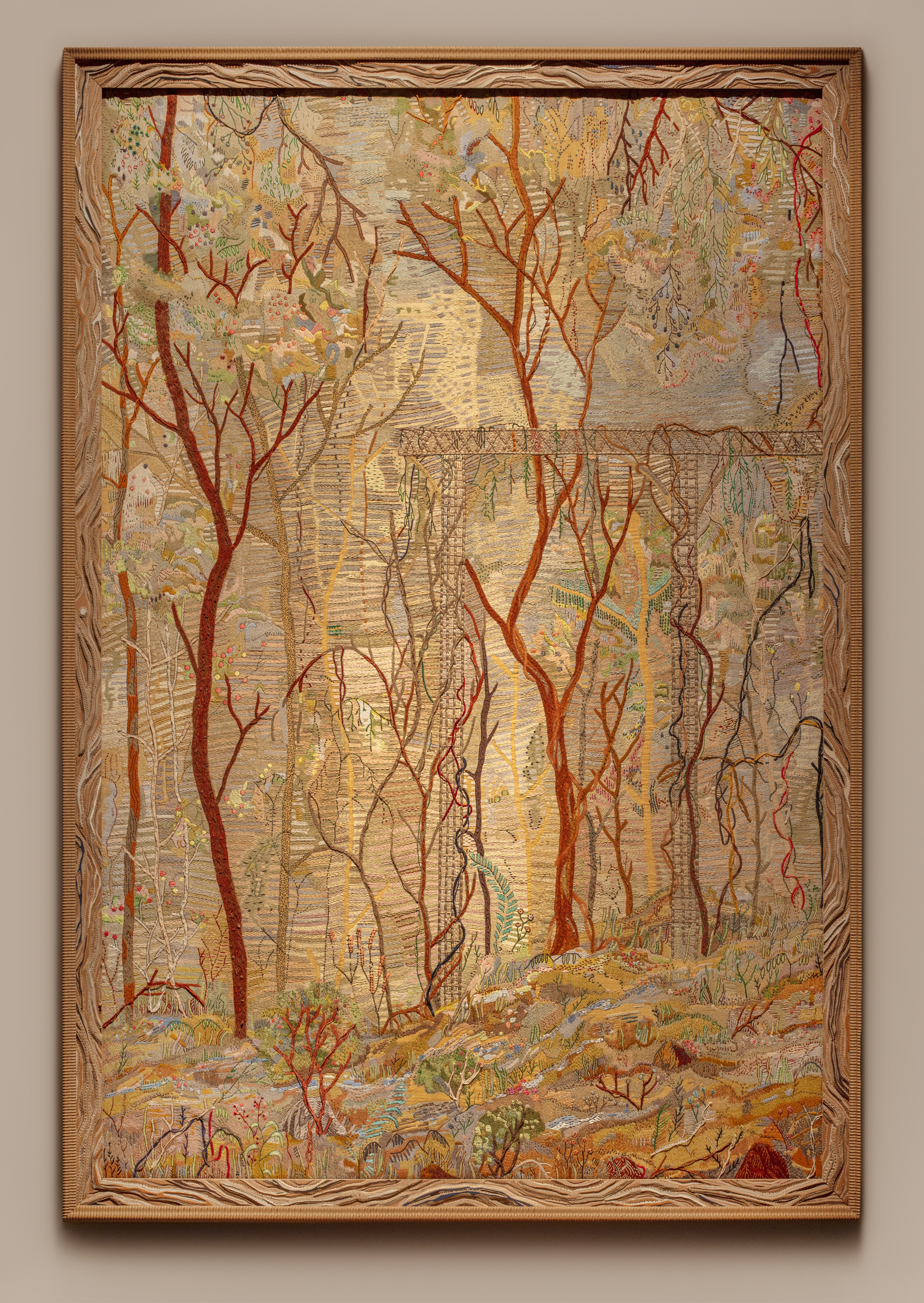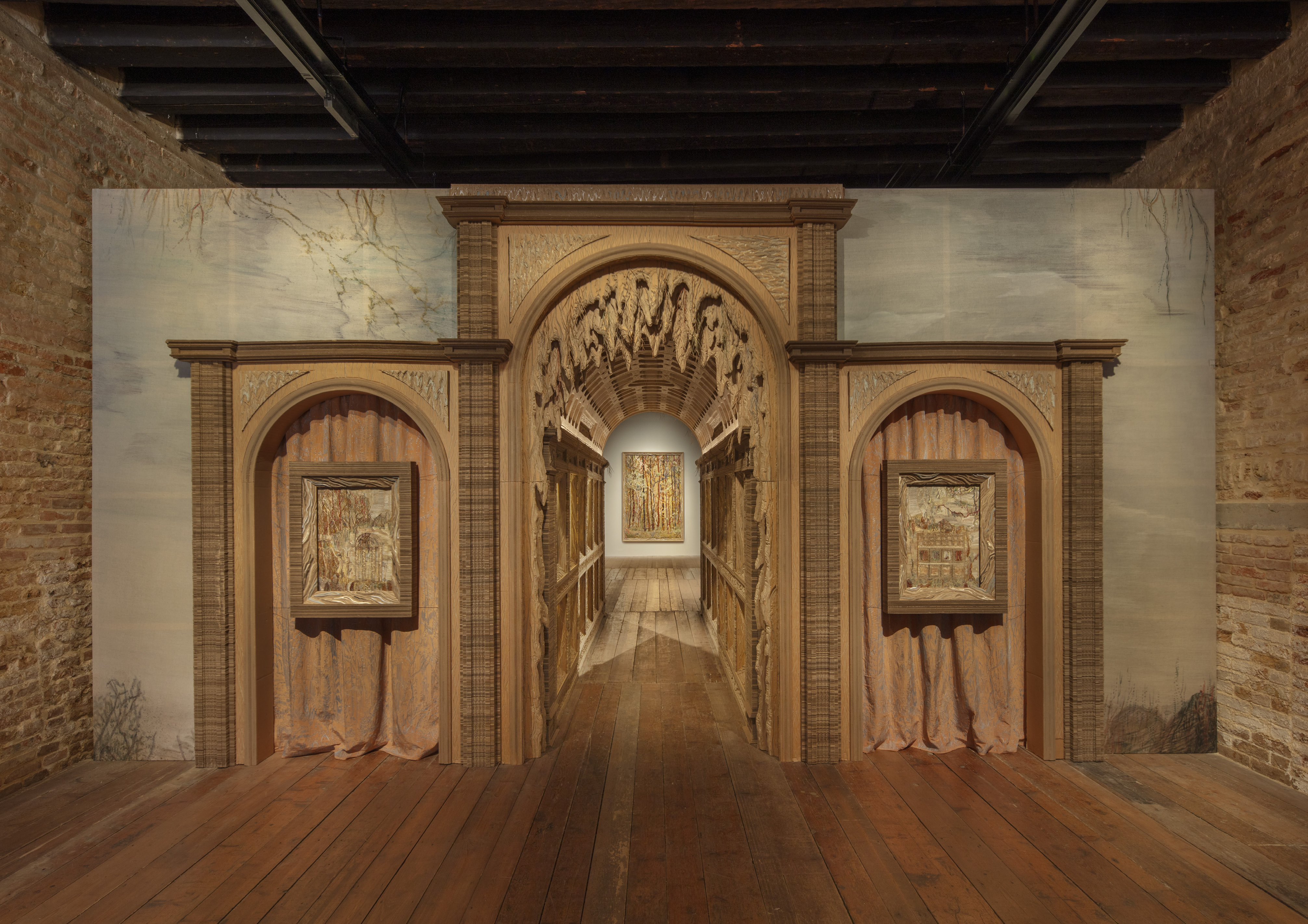 Una mostra di carattere che si relaziona a suo modo con l’allestimento dell’atelier di Mariano Fortuny al piano superiore del museo. Nymphées (2022-2024), appare come un omaggio dell’artista alla tradizione architettonica veneziana dal XVI secolo in poi: una serliana articolata in un’apertura centrale ad arco e due laterali trabeate al cui interno sono appesi due ricami incorniciati, sovrapposti, a loro volta, ad altri ricami, chiusa ai lati da due pannelli i dipinti a trompe-l’oeil di soggetto agreste fanno eco a quelli eseguiti da Fortuny nel “giardino d’inverno” al primo piano dell’abitazione.