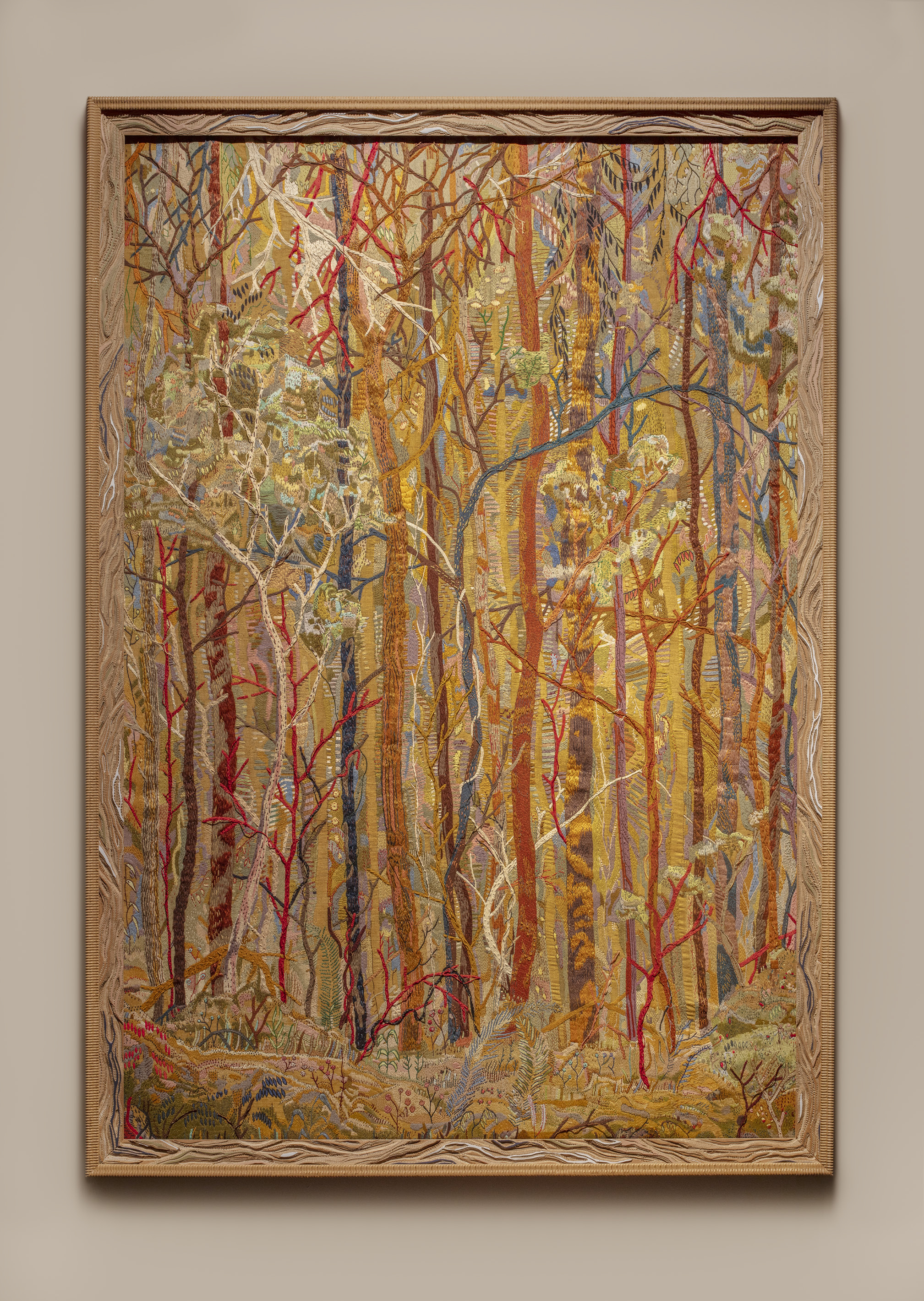 L’atmosfera in cui ci addentriamo è quasi fiabesca, a tratti misteriosa, ci troviamo di fronte ad un’imponente architettura che solo ad un secondo sguardo più ravvicinato capiamo essere composta interamente da strati di cartone modellato in incredibili forme e paesaggi. Allo stesso modo i bellissimi quadri colorati che rappresentano foreste incantate si rivelano essere fitti ricami a mano, talvolta sovrapposti in modo da ricreare la vegetazione di una vera selva. Una serie di rimandi a vari temi rende molto interessante il percorso espositivo. Infatti è attraverso la creatività e a processi operativi e intellettuali che Eva Jospin tratta questioni ecologiche e ambientali. Paesaggi, alberi, piante, rami, foglie, formazioni geologiche, brani di vegetazione, strutture architettoniche, sono da sempre al centro della ricerca dell’artista, colte tanto nel suo stato originario quanto nelle molteplici interpretazioni iconografiche e iconologiche che ne sono state offerte nel corso del tempo.