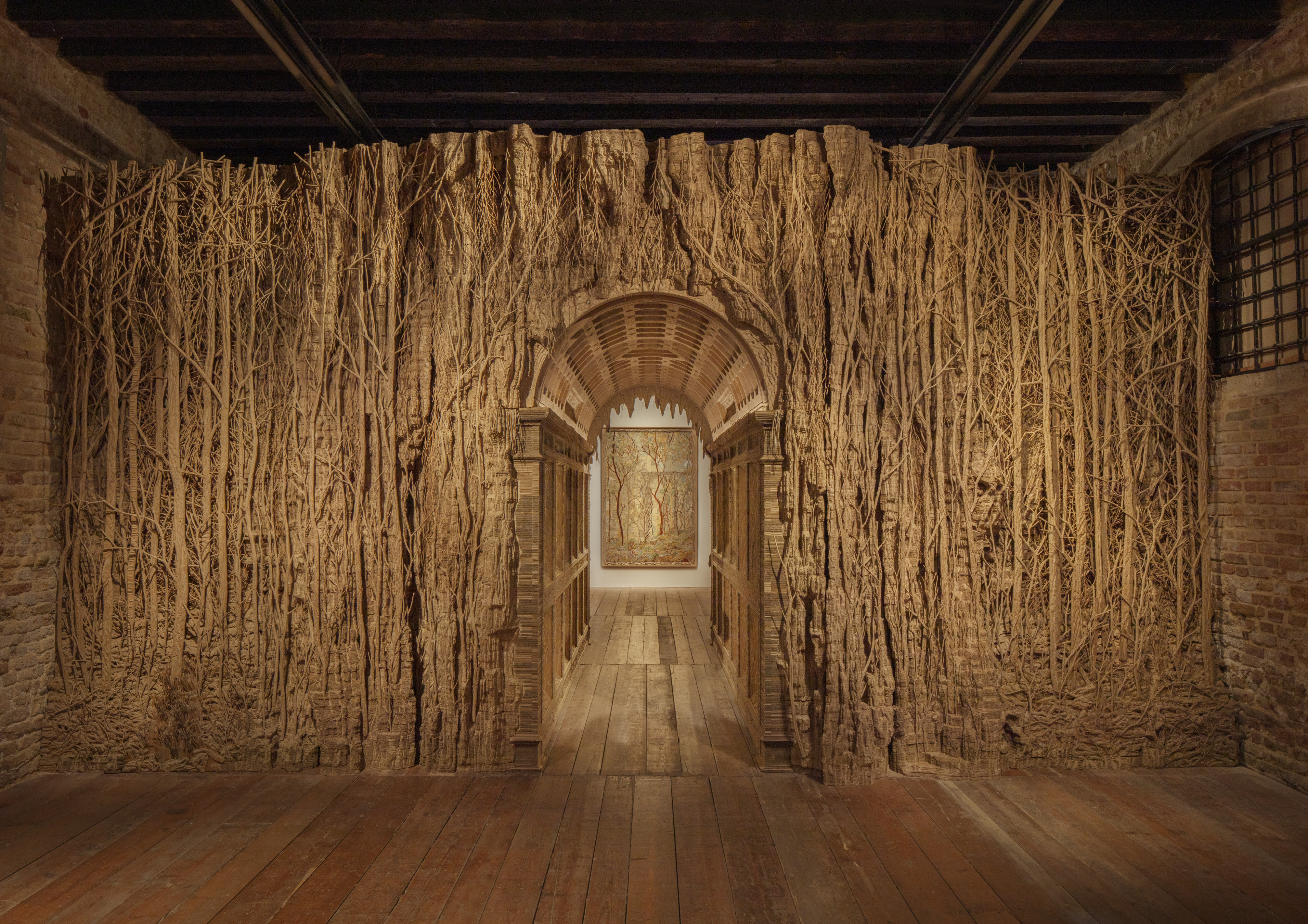 Cartone, elementi e fibre vegetali, parti metalliche, tessuto, sono questi gli elementi che compongono Selva, la mostra di Eva Jospin a cura di Chiara Squarcina e Pier Paolo Pancotto, in collaborazione con Galleria Continua. Il piano terra del Museo Fortuny prende una forma nuova, la grande sala viene infatti trasformata, anche architettonicamente, dall’artista che con le sue composizioni plastiche è riuscita a creare un imponente corridoio che accompagna il visitatore introducendo alla mostra e al suo lavoro.