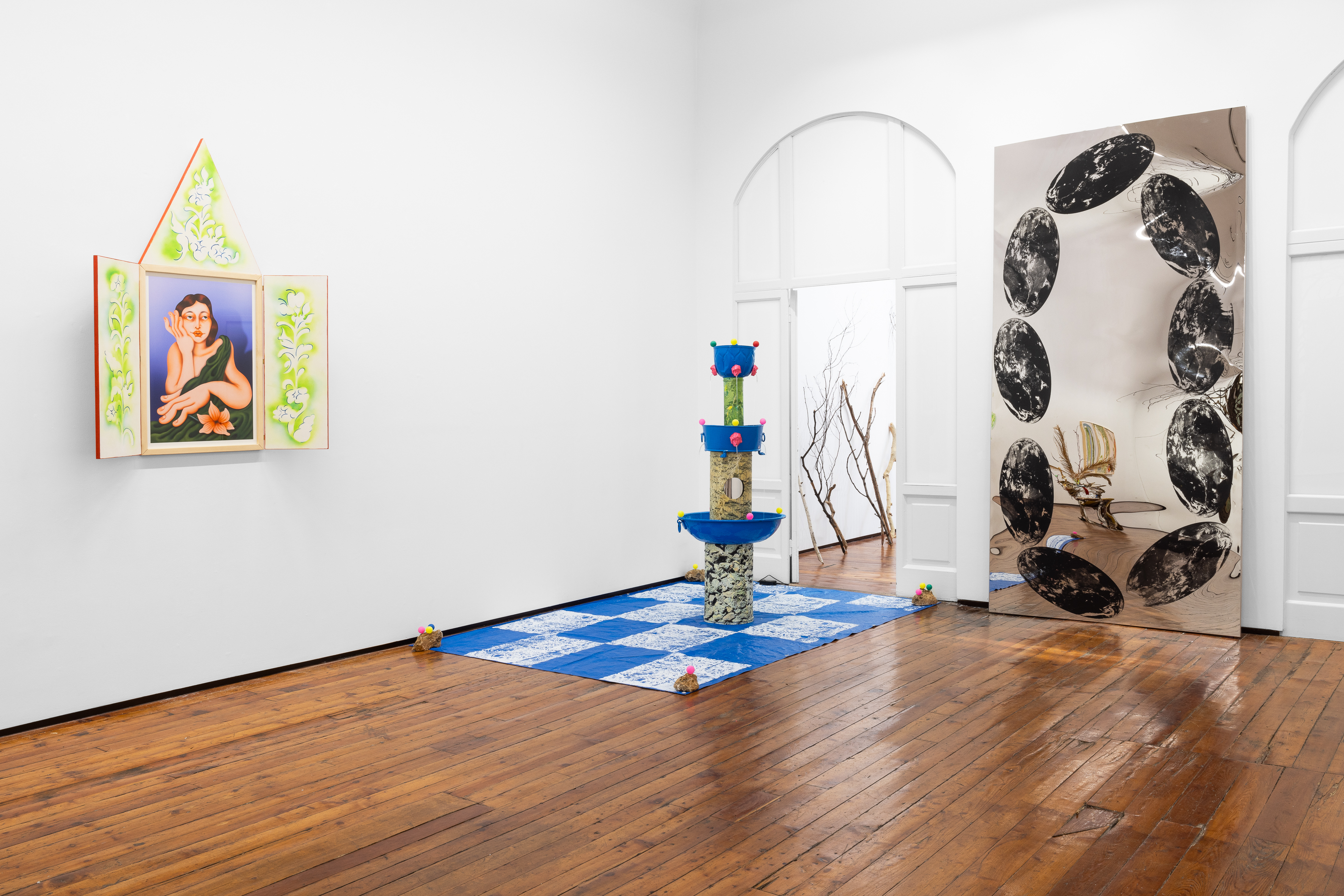 Luigi Pensa, giovanissimo artista di origine torinese, gioca, nella sua ricerca artistica, con i materiali. Colloca all’interno della mostra la Fontana del giocoliere, svilippata su più piani come una vera fontana da giardino, funzionante. I dettagli dell’opera sono caratterizzati da colori cangianti, le faccette che tempestano il perimetro sono autoritratti realizzati in stampa 3D. Un’altra tecnica cara all’artista è quella della serigrafia, attraverso la quale conferisce significati nuovi a oggetti di comune utilizzo come capi di abbigliamento o elementi di arredamento. La serigrafia fin questo caso viene applica ai “mondi” dipinti sul bordo di Portal to paradise, una lastra di alluminio che si rivela come uno specchio distorto.
