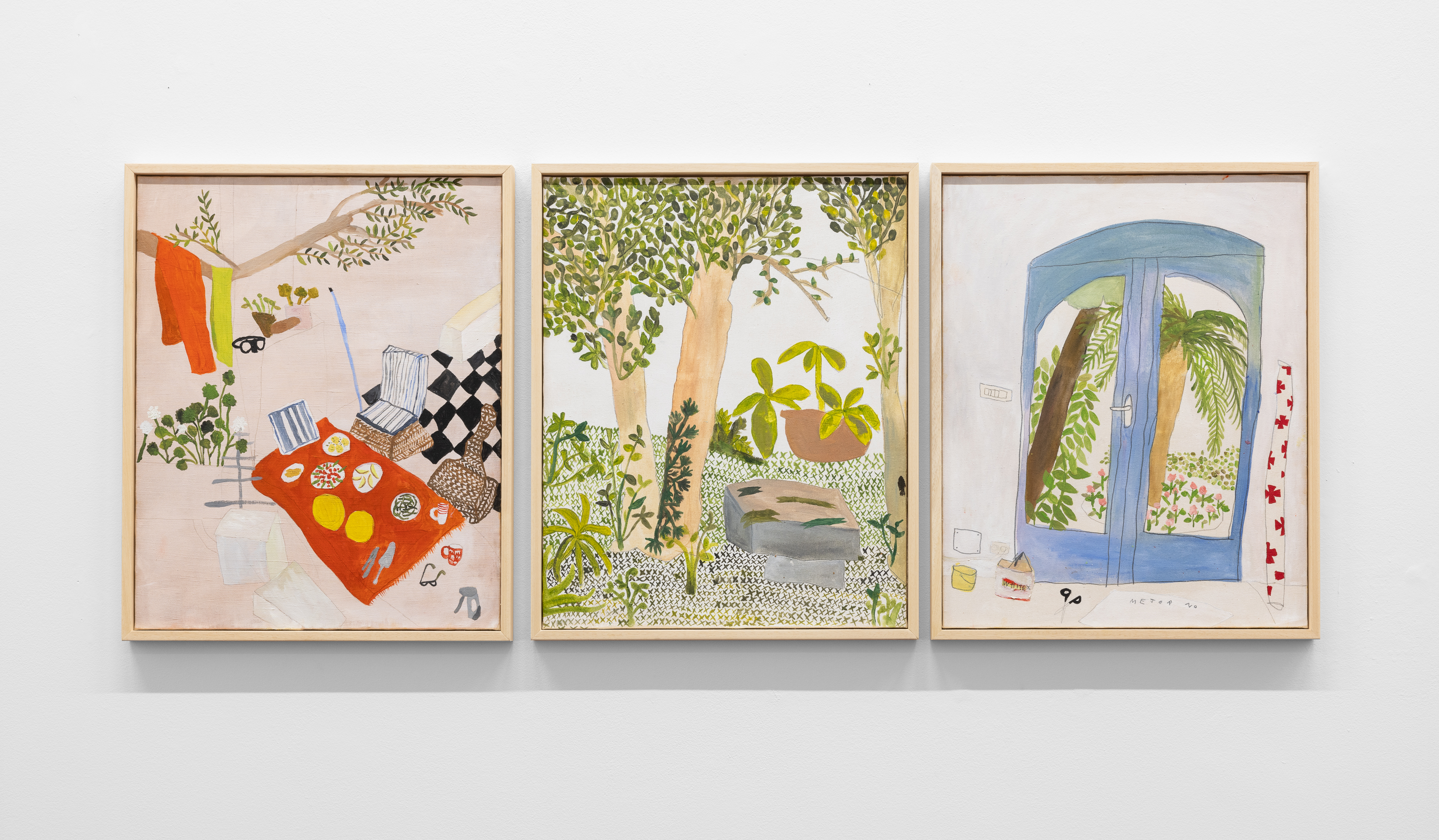 I vasi in argilla non cotta collocati sul fondo della sala, nell’angolo sinistro, sono a firma di Clara Cébrian. L’artista conferisce spiccati tratti mediterranei alle sue opere, attraverso procedure semplici che attirano l’attenzione su concetti e oggetti dell’ordinario. L’artista è autrice anche della serie di dipinti: Hydra, Greece: June 2023; Saro, Spain: August, 2023; Syracusa, Italy: July 2023. Un linguaggio naïf dal carattere domestico pervade chi osserva e dà la chiave d’ingresso al sincero giardino dell’artista spagnola.