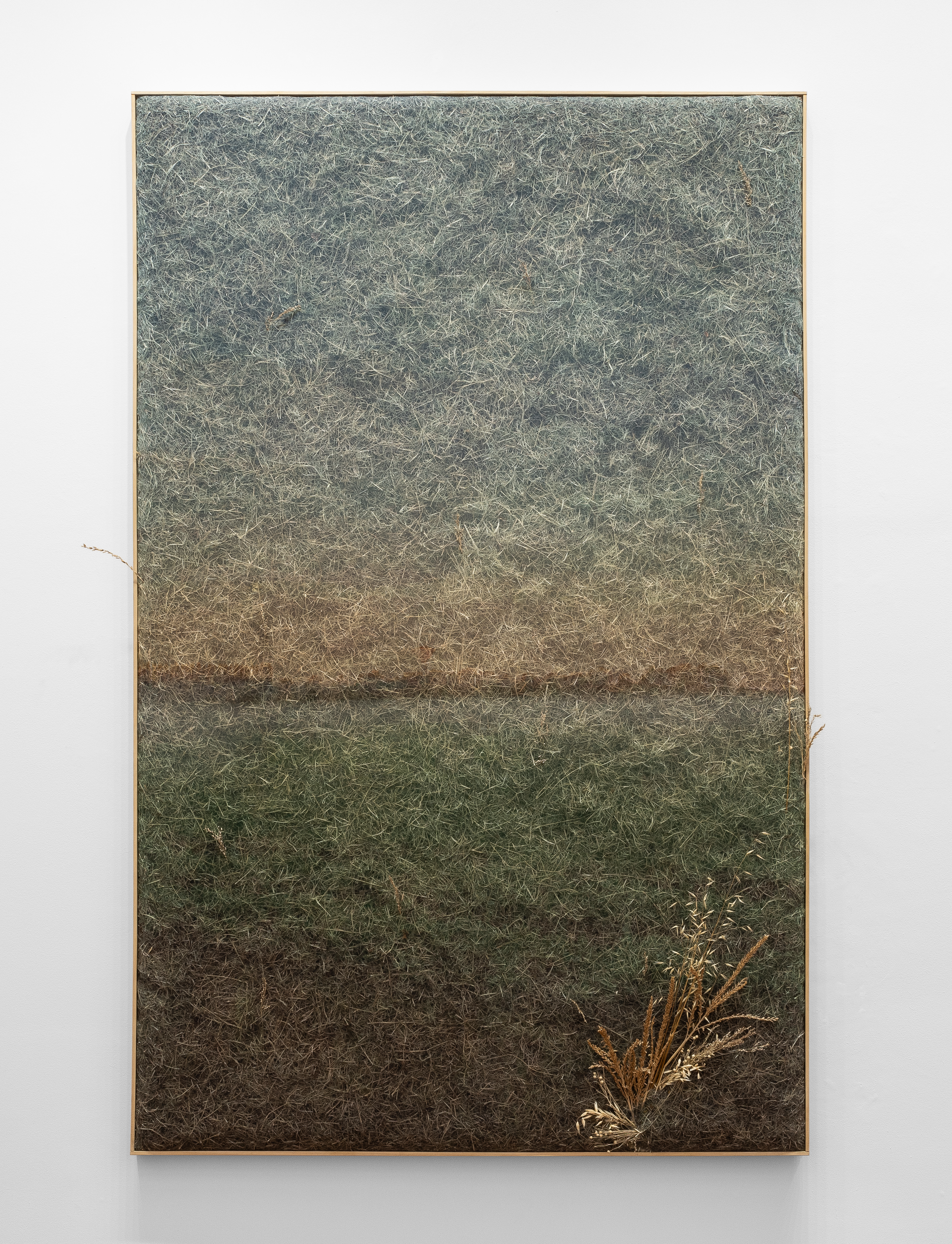 Luca Boffi Dinanzi casa un campo di grano, 2023 Fotografia su tulle, erba essiccata, legno 250x160x18 cm