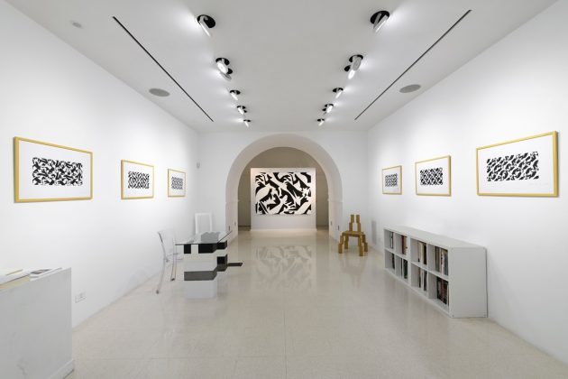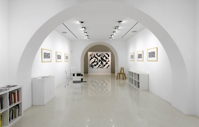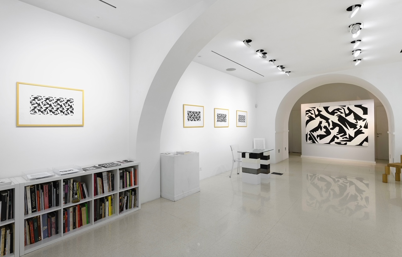 In questo modo, l’artista dà luogo a una generazione di forme evocative, in cui la disposizione a scacchiera di body-tiles, poco complesse, circondate da limb-tiles, più complesse, crea figure che stimolano l’interpretazione visiva. Nel quilting risiede un delicato equilibrio tra rigore matematico e potenziale espressivo: ogni combinazione segue le stesse regole ma gli esiti visivi sfuggono alla prevedibilità, sono unici. Con la mostra alla Galleria La Nuvola si ha l’occasione di osservare gli esemplari cartacei di questa ricerca più recente di Sergio Lombardo, in un elegante allestimento di soli lavori in bianco e nero e con una tela hazard.