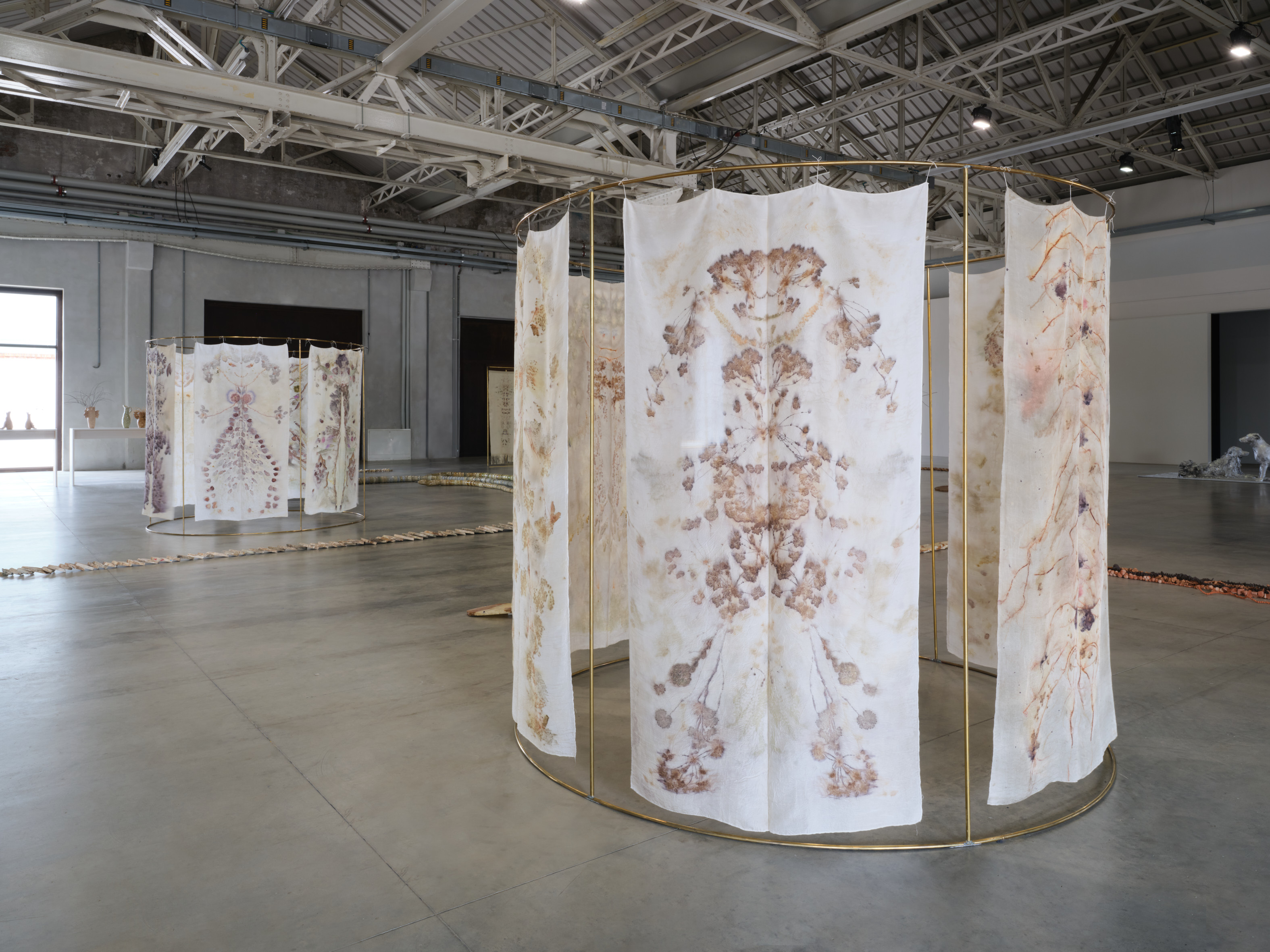 Non si deve però dimenticare quel pizzico di magia che aleggia come un tacito accordo, bisbigliato dalle dieci Sisters (2019-in corso), che sorridono serafiche al visitatore. Cumuli stratificati di argilla, rami e fiori, le sculture naturali si ergono dal suolo come idoli che rimandano al culto della Dea Madre associata alla Terra. Come scrive Clarissa Pinkola Estés nel suo libro Donne che corrono coi lupi – oltretutto una delle Sisters raffigura proprio un lupo – la madre della creazione è sempre anche la madre della morte, riunendo nell’ancestrale figura femminile della Grande Madre la capacità di donare la vita e il compito di toglierla, per una ciclicità del tempo connaturato al passare delle stagioni e con esse, all’avvicendarsi delle età degli esseri umani. Queste figure arboree ritornano impresse su drappi di seta appesi a strutture circolari in ottone, impegnate in un rito di cui non ci è concesso udire le parole.